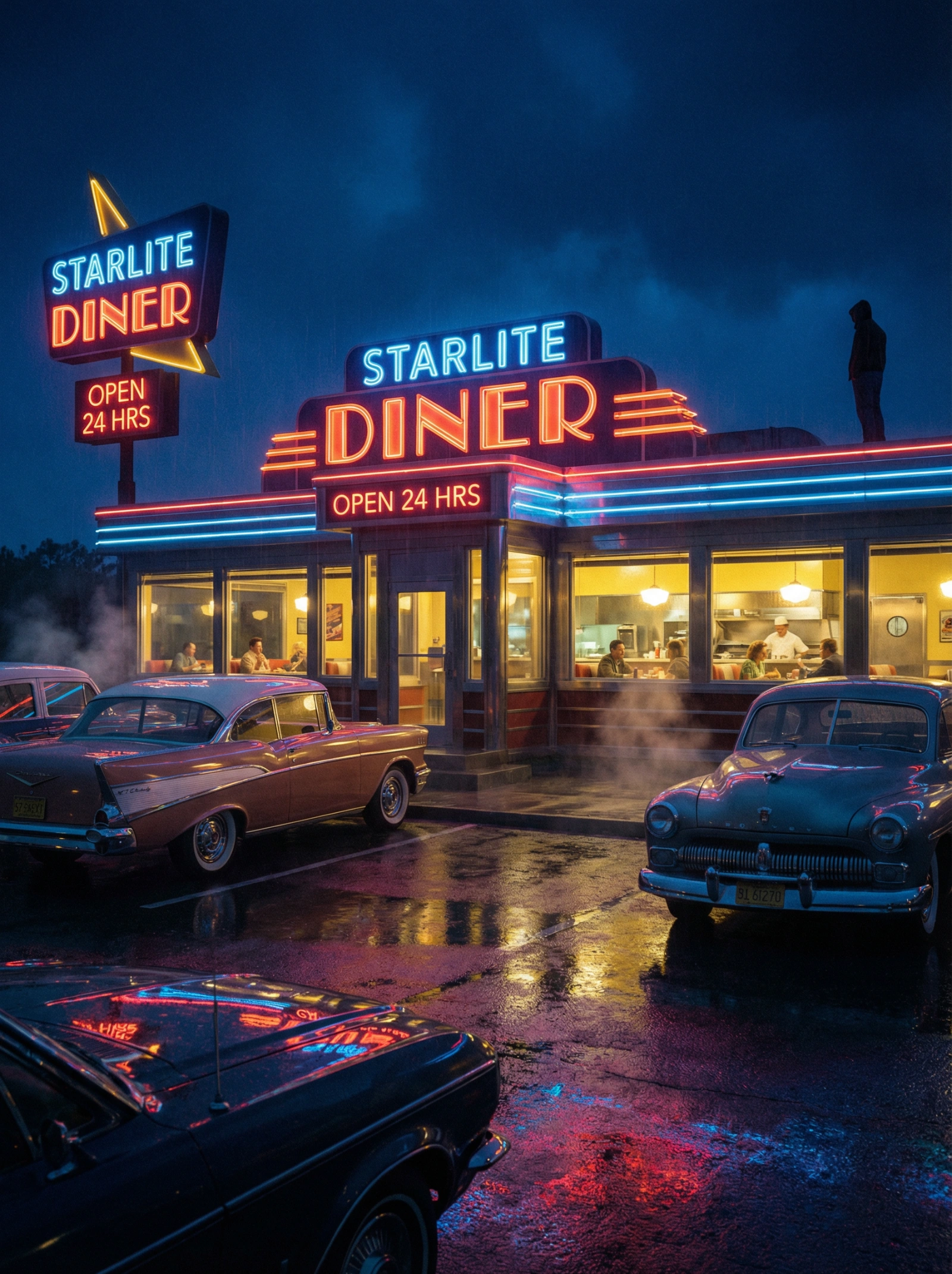 Create a cinematic, wide-aspect ratio shot of a vintage 1950s American diner at night. The exterior is illuminated by buzzing neon signage that reflects off the wet pavement and the chrome bumpers of classic cars parked in front. Through the large glass windows, we can see patrons eating and talking in a warm, yellow light. The contrast between the cool blue night outside and the warm interior is essential. The image should evoke a sense of Americana and nocturnal solitude, similar to an Edward Hopper painting but photorealistic.
