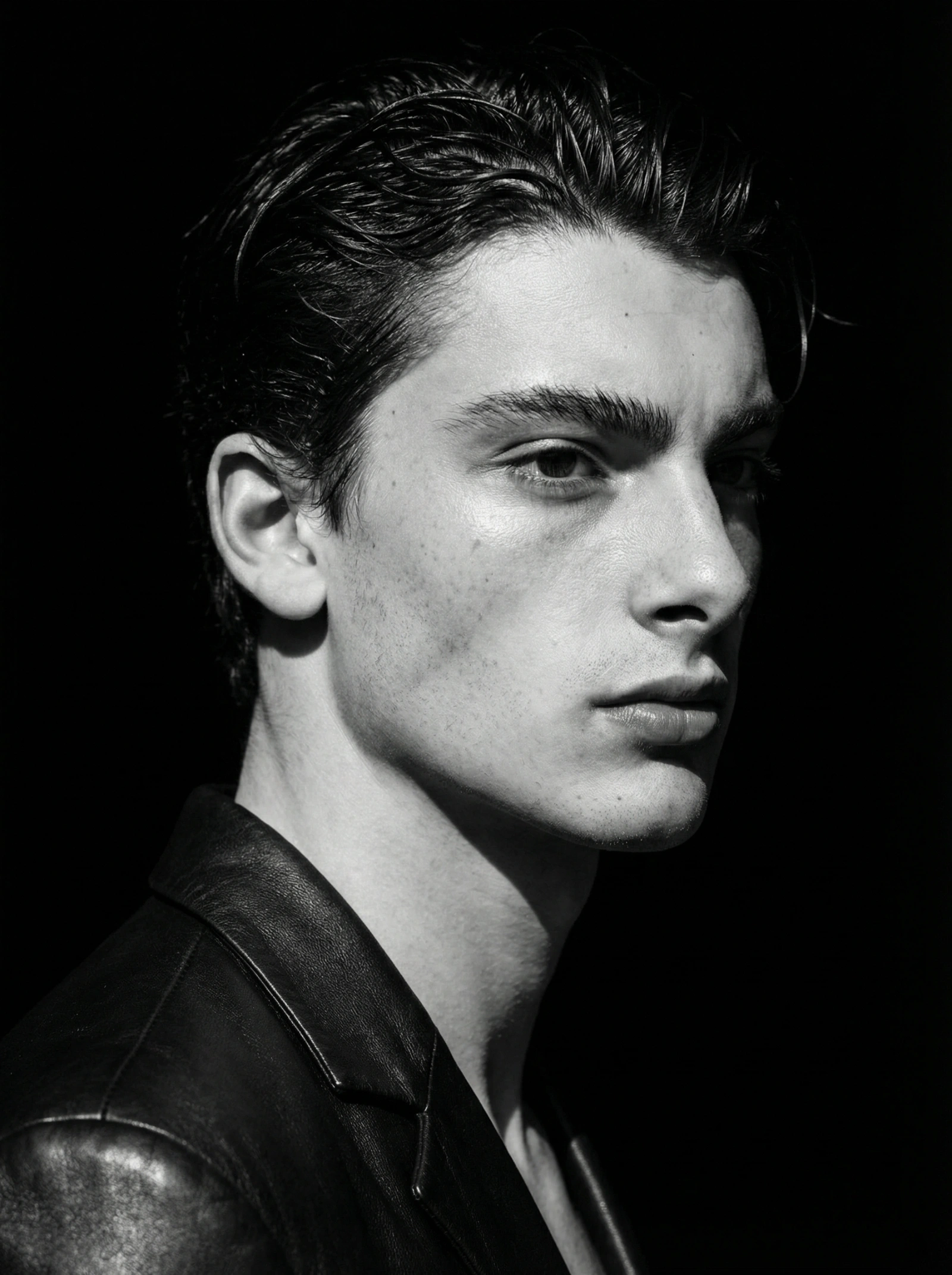 { "type": "image_generation_prompt", "concept": { "description": "A striking high-contrast black and white portrait inspired by classic film noir and modern luxury perfume ads. The subject is posed in a 3/4 view, looking past the camera. The lighting is harsh and deliberate (Chiaroscuro), creating deep shadows on one side of the face while highlighting the cheekbone and eye structure on the other.", "mood": "dramatic, mysterious, timeless", "color_theme": "monochrome, silver gelatin tones" }, "subject": { "gender": "female", "identity_preservation": { "use_reference_image": true, "alter_face": false, "notes": "Strictly preserve facial identity; emphasize skin pores and natural imperfections in high detail." }, "pose": { "name": "The Muse", "head_position": "turned 45 degrees to the right", "eyes": "open, gazing into the distance", "expression": "intense, stoic, powerful", "highlight": "specular highlight on the cheekbone and lower lip" }, "appearance": { "hair": { "style": "slicked back, wet-look styling", "lighting_effect": "high gloss reflection" }, "clothing": { "shirt": "structured black leather blazer", "fabric": "smooth leather with realistic grain", "collar": "sharp lapels", "details": { "shadows": "deep blacks in clothing folds", "texture": "visible leather grain vs. smooth skin" } }, "accessories": "none" } }, "camera_settings": { "camera": "Leica M10 Monochrom", "lens": "Summilux-M 90mm f/1.5", "aperture": "f/4.0", "iso": 64, "shutter_speed": "1/125s", "framing": "tight headshot, 4:5 format", "resolution": "Ultra-HD 8K", "focus": "razor-sharp textural focus across the illuminated side of the face" }, "lighting": { "type": "Rembrandt style studio strobe", "background": "pitch black", "effects": [ "hard shadow transitions", "high micro-contrast", "sculpted facial features" ] }, "visual_style": { "genre": "fine art photography", "contrast_level": "very high", "tone": "sophisticated, edgy", "keywords": [ "chiaroscuro", "noir", "textural", "sculptural" ] }, "output_goal": "Create a museum-quality B&W portrait that focuses on the interplay of light and shadow, preserving identity while delivering a powerful, dramatic impact." }