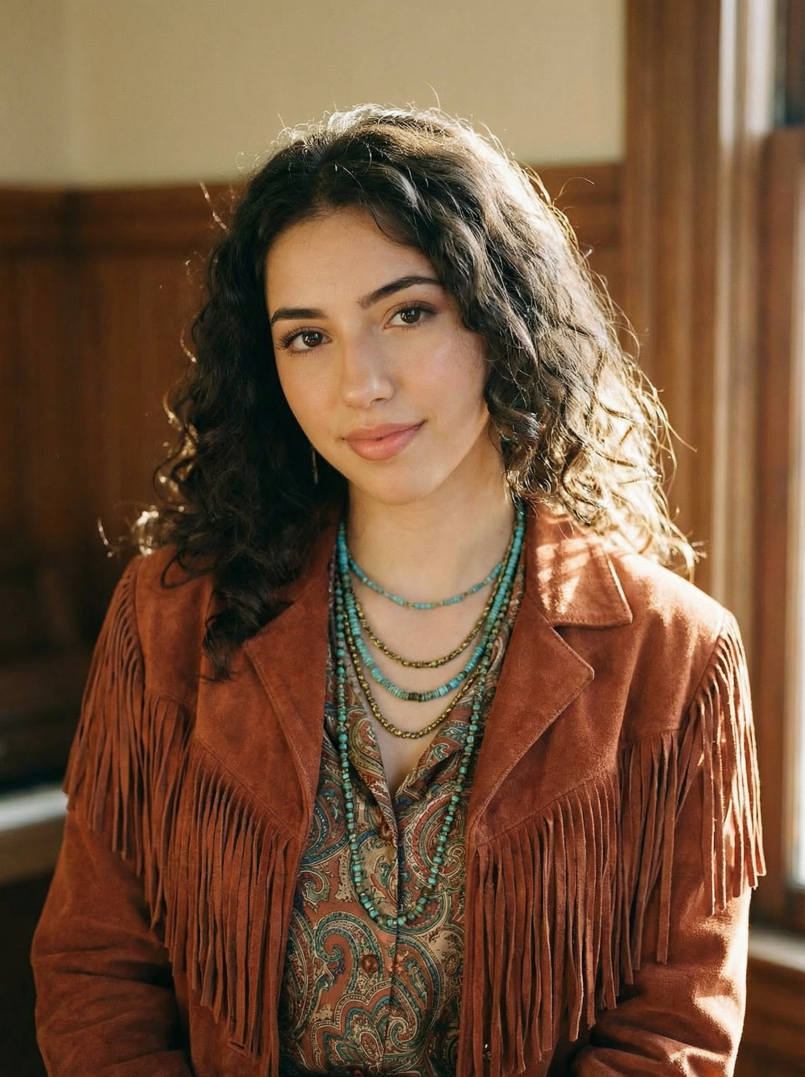{ "type": "image_generation_prompt", "concept": { "description": "A warm, nostalgic portrait evocative of 1970s fashion editorial on film. The subject has a relaxed, natural pose, illuminated by simulated warm afternoon window light. The image has a distinct analog film grain texture and a rich, earthy color palette.", "mood": "free-spirited, warm, organic", "color_theme": "earth tones: terracotta, mustard yellow, warm browns" }, "subject": { "gender": "female", "identity_preservation": { "use_reference_image": true, "alter_face": false, "notes": "Maintain facial identity exactly. Skin finish should look natural, not overly retouched." }, "pose": { "name": "Relaxed Gaze", "head_position": "slight tilt, looking softly towards the camera", "expression": "gentle, natural smile", "highlight": "warm light catching the texture of the suede" }, "appearance": { "hair": { "style": "loose, natural voluminous curls or waves", "lighting_effect": "soft warm backlighting" }, "clothing": { "shirt": "vintage suede jacket with fringe details over a silk blouse", "fabric": "rich textured suede leather and patterned silk", "details": { "texture": "highly visible suede nap", "layering": "silk scarf loosely tied at neck with paisley pattern" } }, "accessories": "layered turquoise and aged gold necklaces" } }, "camera_settings": { "camera": "Hasselblad 500C/M (Analog Film Emulation)", "lens": "Carl Zeiss Planar 80mm f/2.8", "aperture": "f/4", "iso": "Kodak Portra 400 emulation", "shutter_speed": "1/60s", "framing": "medium portrait, 4:5 vertical", "resolution": "Ultra-HD 8K scan", "focus": "soft but precise eye focus, natural lens vignetting" }, "lighting": { "type": "simulated natural window light (large softbox)", "background": "softly blurred vintage interior wall with wood paneling hint", "effects": [ "warm color cast", "soft shadow transitions", "film grain texture overlay" ] }, "visual_style": { "genre": "vintage fashion editorial", "contrast_level": "medium-low", "tone": "nostalgic, warm", "keywords": ["retro", "70s style", "analog film", "bohemian luxury"] }, "output_goal": "Create an authentic-feeling vintage film portrait, preserving identity while emphasizing the textures of suede and natural hair in warm light." }