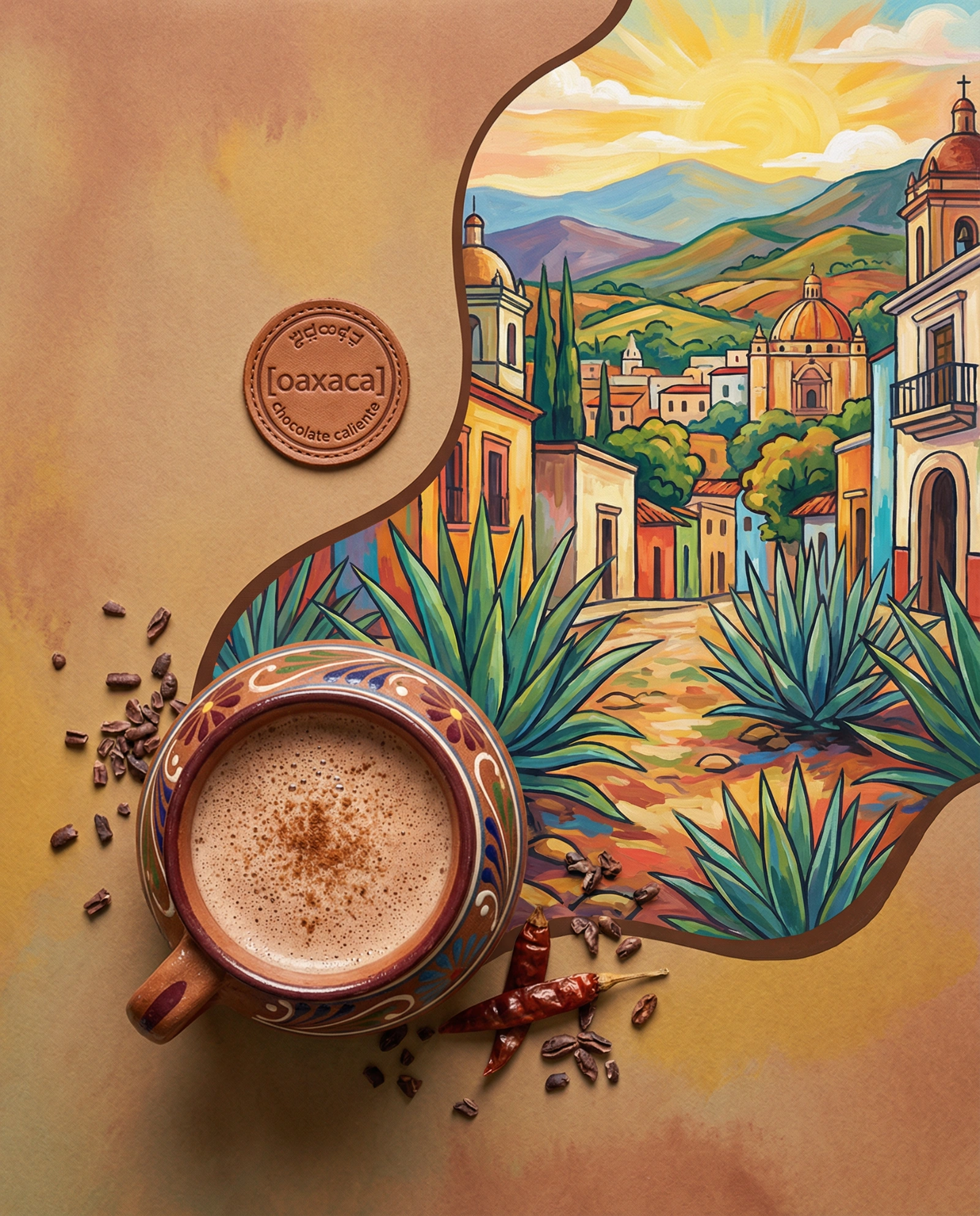 [Credits to https://x.com/AztecaAlpaca] A top-down photograph with a 3:4 aspect ratio. A distinct [hand-painted clay mug] suitable for the region, containing [Mexican hot chocolate] presented authentically according to [Oaxaca, Mexico]'s traditions, has its center positioned precisely at a golden ratio intersection point (e.g., bottom-left). The vessel physically overlaps and presses down upon an inner corner of a large, singular painterly illustration block. The main body of this illustration is balanced off-center, weighted towards the corner opposite the mug. Instead of a collage or repeating pattern, the illustration is a unified, continuous scene contained within a flowing, organic, or irregular geometric boundary (not a rigid rectangle). This singular artwork is rendered in the specific painterly style of [Oaxacan folk art] and depicts iconic landscapes or urban scenes of [Oaxaca, Mexico]. Crucially, there is a noticeable "margin" of textured negative space (approximately 1/3 of the frame's total width/height) between the outer boundaries of this distinct illustration shape and the physical edge of the square frame. The color palette of the surrounding textured, muted background is elegant and directly derived from the hues of the [Mexican hot chocolate] itself. Placed within the significant negative space is a small, culturally distinct object serving as an auxiliary label (e.g., seal, postmark) with "[Oaxaca]" and "[chocolate caliente]" unobtrusively inscribed in the native language/script. Scattered raw [cacao nibs] are arranged artfully around the vessel and the edges of the illustration boundary. Soft, natural, overhead lighting.