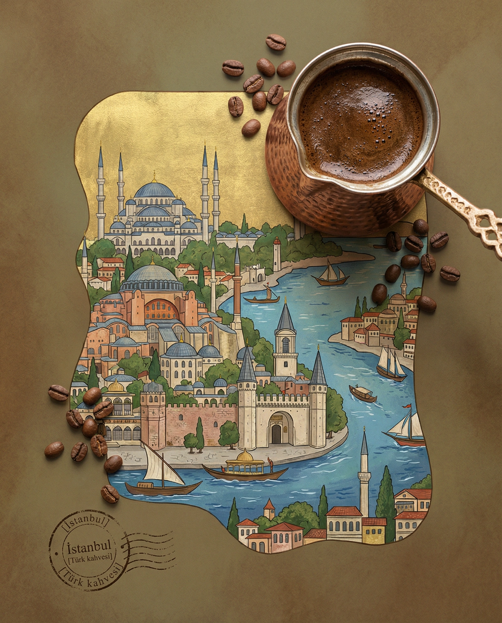 [Credits to https://x.com/AztecaAlpaca] A top-down photograph with a 3:4 aspect ratio. A distinct [ornate copper cezve] suitable for the region, containing [Turkish coffee] presented authentically according to [Istanbul, Turkey]'s traditions, has its center positioned precisely at a golden ratio intersection point (e.g., top-right). The vessel physically overlaps and presses down upon an inner corner of a large, singular painterly illustration block. The main body of this illustration is balanced off-center, weighted towards the corner opposite the mug. Instead of a collage or repeating pattern, the illustration is a unified, continuous scene contained within a flowing, organic, or irregular geometric boundary (not a rigid rectangle). This singular artwork is rendered in the specific painterly style of [Ottoman miniature art] and depicts iconic landscapes or urban scenes of [Istanbul, Turkey]. Crucially, there is a noticeable "margin" of textured negative space (approximately 1/3 of the frame's total width/height) between the outer boundaries of this distinct illustration shape and the physical edge of the square frame. The color palette of the surrounding textured, muted background is elegant and directly derived from the hues of the [Turkish coffee] itself. Placed within the significant negative space is a small, culturally distinct object serving as an auxiliary label (e.g., seal, postmark) with "[İstanbul]" and "[Türk kahvesi]" unobtrusively inscribed in the native language/script. Scattered raw [coffee beans] are arranged artfully around the vessel and the edges of the illustration boundary. Soft, natural, overhead lighting.