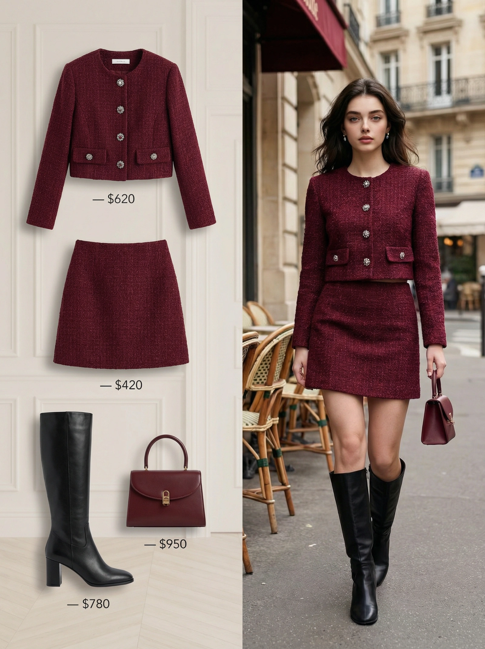 A refined high-fashion editorial image with a 3:4 aspect ratio, split into two clear vertical sections. RIGHT SIDE: A fashionable, confident, elegant woman casually standing and walking in a Parisian street café setting. Classic Paris architecture in the background, stone buildings, subtle café chairs, soft natural daylight. She wears a burgundy tweed cropped jacket with jewel buttons and a matching slim-fit A-line mini tweed skirt. The tweed fabric texture is highly detailed and clearly visible, rich woven structure, luxury craftsmanship. On her feet are black knee-high leather boots, timeless and chic. She carries a small structured burgundy handbag. Her hair is worn naturally loose, softly framing her face. Minimal makeup, refined facial features, subtle earrings. The look is elegant, Parisian, sophisticated, and effortlessly chic. Natural daylight, soft shadows, realistic skin texture. Editorial street-style fashion photography with a high-end luxury feel, muted yet rich color palette, shallow depth of field, cinematic realism. STYLE & MOOD: Parisian elegance, quiet luxury, confident femininity, timeless, editorial. PHOTOGRAPHY DETAILS: Eye-level angle, candid stance, 35mm lens, natural lighting, high detail, photorealistic. LEFT SIDE: A clean, minimalist luxury product breakdown layout on a soft neutral background inspired by Parisian interiors. The individual fashion items worn by the woman are displayed separately, neatly arranged with subtle shadows. No people on this side. Each item includes a small, elegant price label in refined sans-serif typography. – Burgundy tweed cropped jacket with jewel buttons — $620 – Burgundy slim-fit A-line mini tweed skirt — $420 – Black knee-high leather boots — $780 – Small structured burgundy handbag — $950 The left side feels like a luxury fashion catalog or high-end e-commerce lookbook, inspired by Parisian design aesthetics, subtle architectural textures, refined composition. OVERALL STYLE & MOOD: Quiet luxury, Parisian elegance, editorial fashion, high-end retail aesthetic. LIGHTING & QUALITY: Soft natural light, studio-clean clarity on product side, photorealistic, ultra-high resolution, professional fashion photography. NEGATIVE PROMPT: Cluttered layout, oversized text, flashy logos, manne