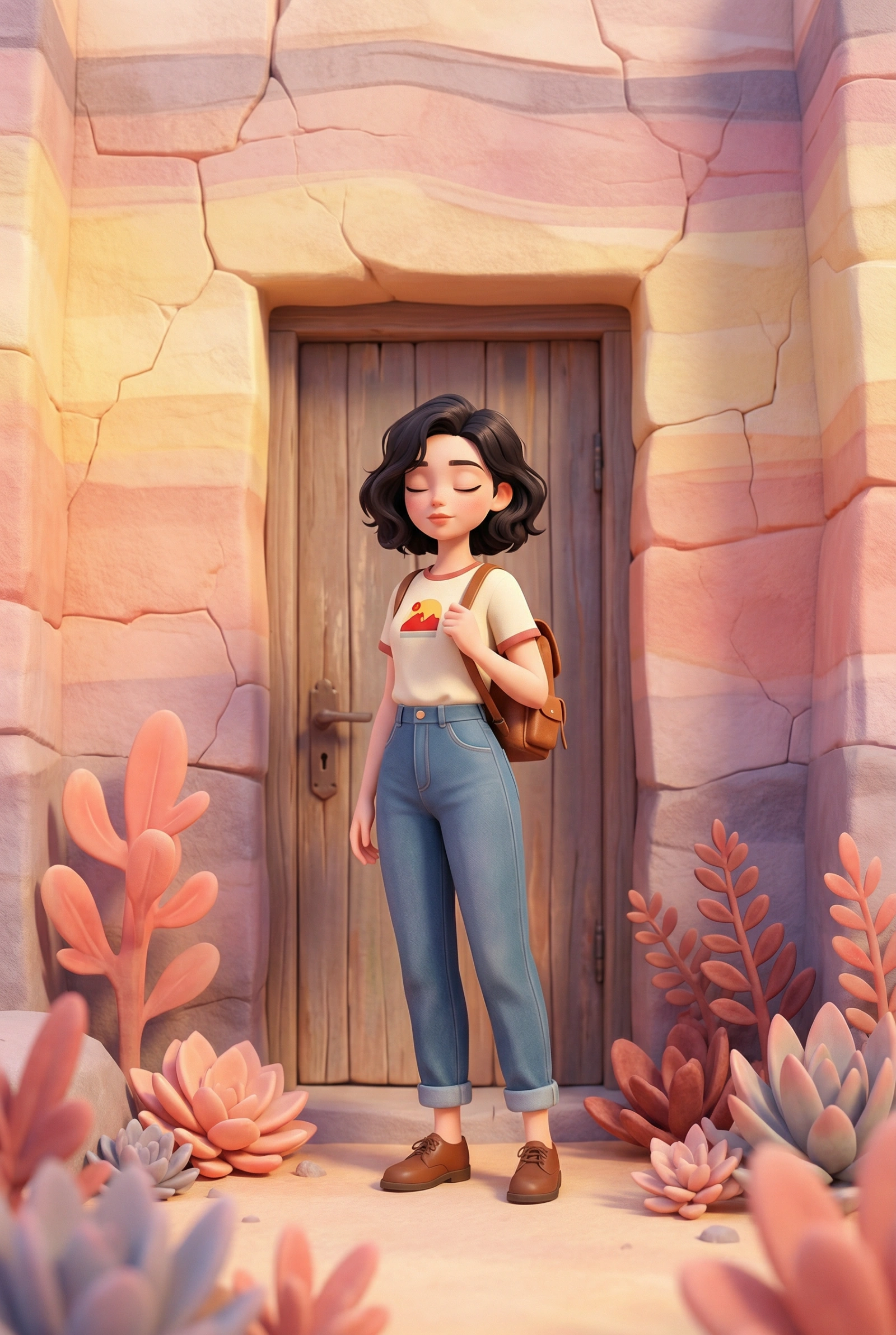 A stylized 3D animated girl standing in front of a rustic wooden door, surrounded by soft coral-pink and dusty red plants, with a layered pastel canyon wall in the background made of cracked textured stone in warm gradients of yellow, peach, pink, and muted purple. The girl has short wavy dark hair, closed eyes, a calm peaceful expression, wearing a cream t-shirt with a small red-yellow graphic, high-waisted blue jeans rolled at the ankles, brown shoes, and a small backpack over one shoulder. Cinematic soft lighting, warm color palette, shallow depth of field, painterly textures, cozy mood, whimsical Pixar-style 3D illustration, ultra-detailed, high resolution, soft shadows, pastel fantasy environment, peaceful atmosphere.