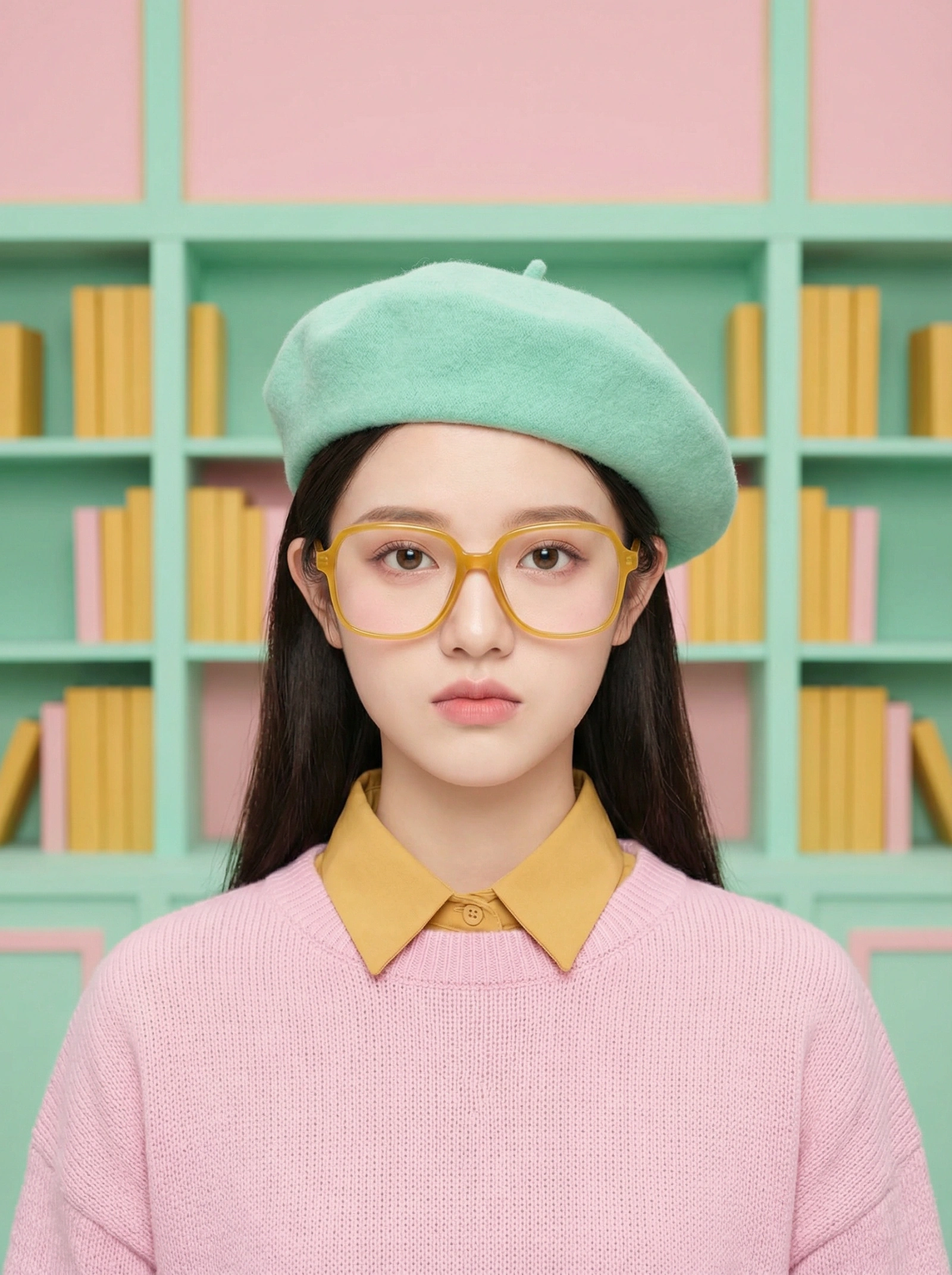 A perfectly symmetrical, center-framed portrait of a quirky librarian wearing a beret and oversized vintage glasses. The color palette is strictly pastel pink, mint green, and mustard yellow. The lighting is flat and shadowless (high key). The subject stares deadpan directly into the camera lens.