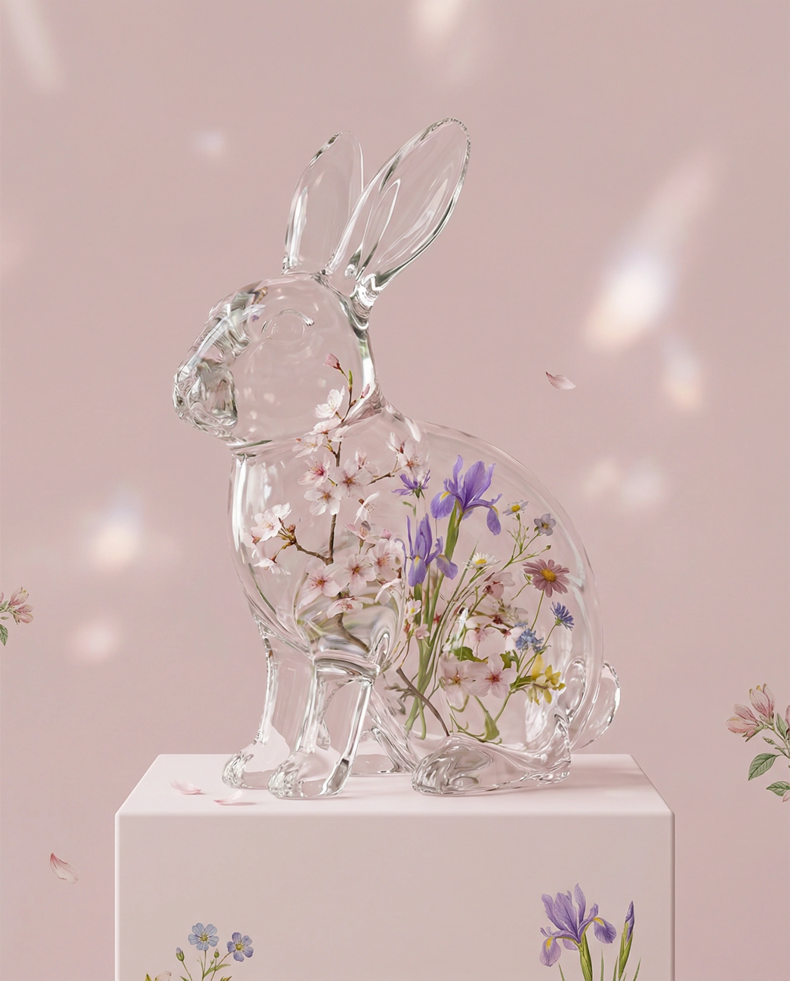 A transparent [rabbit] filled with delicate spring flowers like cherry blossoms, irises, and wildflowers. Hyper-realistic 3D render, soft lighting and reflections, minimal aesthetic, set against a [pastel pink] backdrop, whimsical botanical design, elegant and surreal composition.