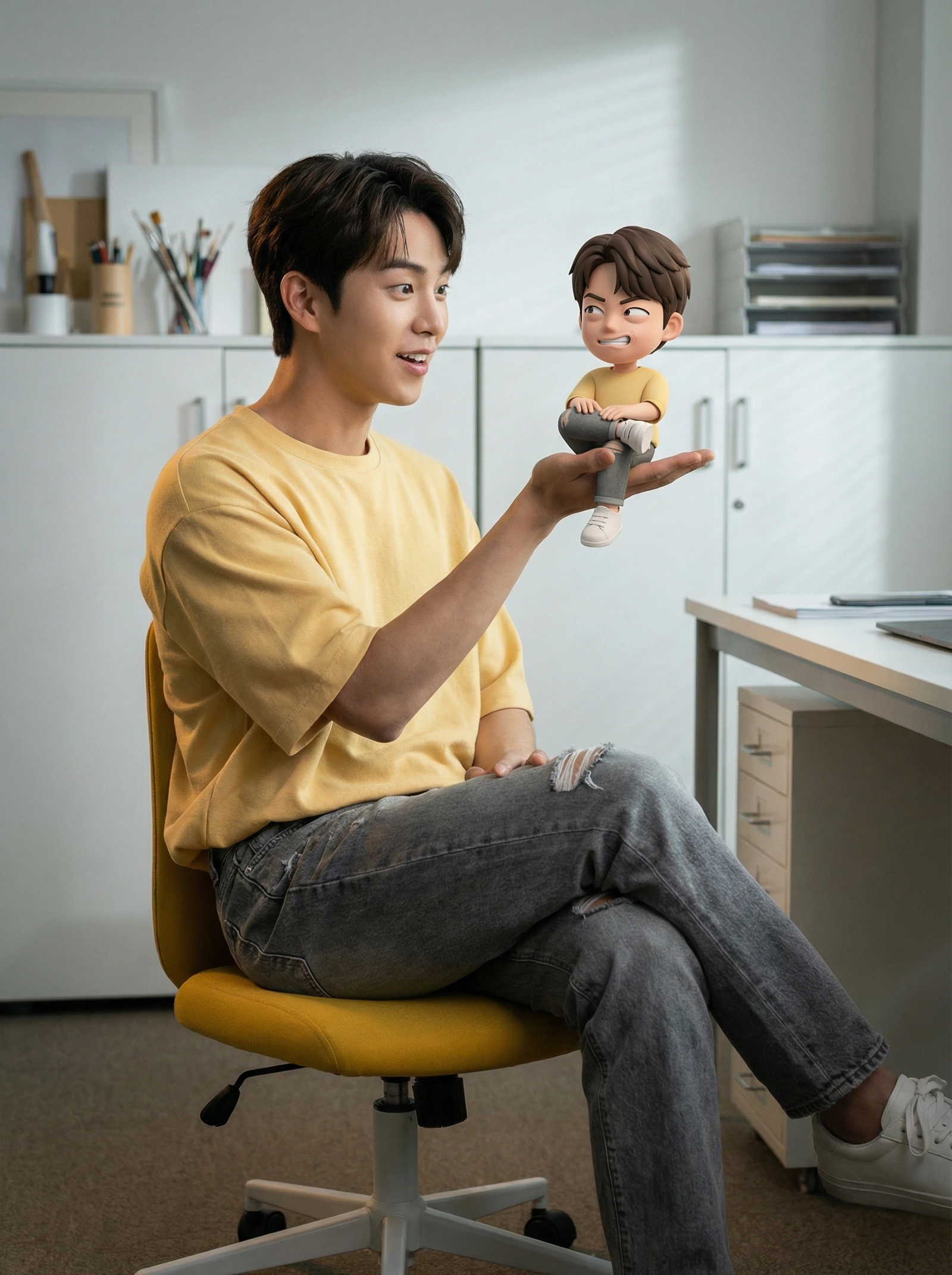 { "reference": { "identity": "Use the attached photo strictly for the real man’s face, identity, hairstyle, and proportions", "constraints": "Do not alter facial features, face shape, skin tone, or identity" }, "composition": { "aspect_ratio": "9:16 (vertical)", "scene_type": "Cinematic portrait with scale contrast", "theme": "Playful realism, balanced humor and authenticity" }, "primary_subject": { "type": "Real adult man", "pose": "Seated on a yellow chair", "action": "Holding a small 3D miniature of himself in the palm of one hand", "expression": { "emotion": "Surprise and slight amusement", "details": "Raised eyebrows, subtle smile, expressive eyes", "authenticity": "Spontaneous and natural" }, "appearance": { "skin": "Natural human skin texture with visible pores and subtle imperfections", "hair": "Realistic hair styled exactly according to the attached photo", "grooming": "Clean eyebrows, subtle contouring, neutral realistic lips, expressive eyes with natural contrast" } }, "miniature_subject": { "type": "3D chibi-style miniature of the same man", "scale": "Clearly smaller, playful size difference compared to the real man", "pose": "Seated with crossed legs, relaxed posture", "expression": "Humorous, exaggerated facial expression with lively eyes", "movement": "Playful arms and legs", "style": "High-quality soft 3D chibi style, clean and modern, not toy-like or doll-like", "accuracy": "Closely matches the real man’s facial structure, hairstyle, and outfit" }, "wardrobe": { "matching_outfits": { "top": "Stylish casual top in egg-yellow tone with modern relaxed fit", "bottom": "Medium-wash distressed jeans", "shoes": "Lightweight white sneakers" } }, "environment": { "location": "Realistic office interior", "elements": [ "White cabinets", "Painting and creative tools", "White desk", "Plastic swivel chair" ], "background": "Slightly blurred with strong depth of field" }, "lighting": { "style": "Professional cinematic lighting", "features": [ "Clear subject separation", "Soft skin highlights", "Subtle rim lighting around both the real man and the miniature" ] }, "camera": { "focus": "Sharp focus on the real man and miniature", "depth_of_field": "Strong depth of field with smooth background blur" }, "visual_style": { "realism": "Ultra-realistic textures for the real man", "miniature_textures": "Clean, realistic 3D textures", "tone": "Balanced realism and humor", "distortions": "None, no surreal effects" }, "quality": { "detail_level": "Ultra-detailed ", "render_style": "High-end cinematic portrait photography" } }