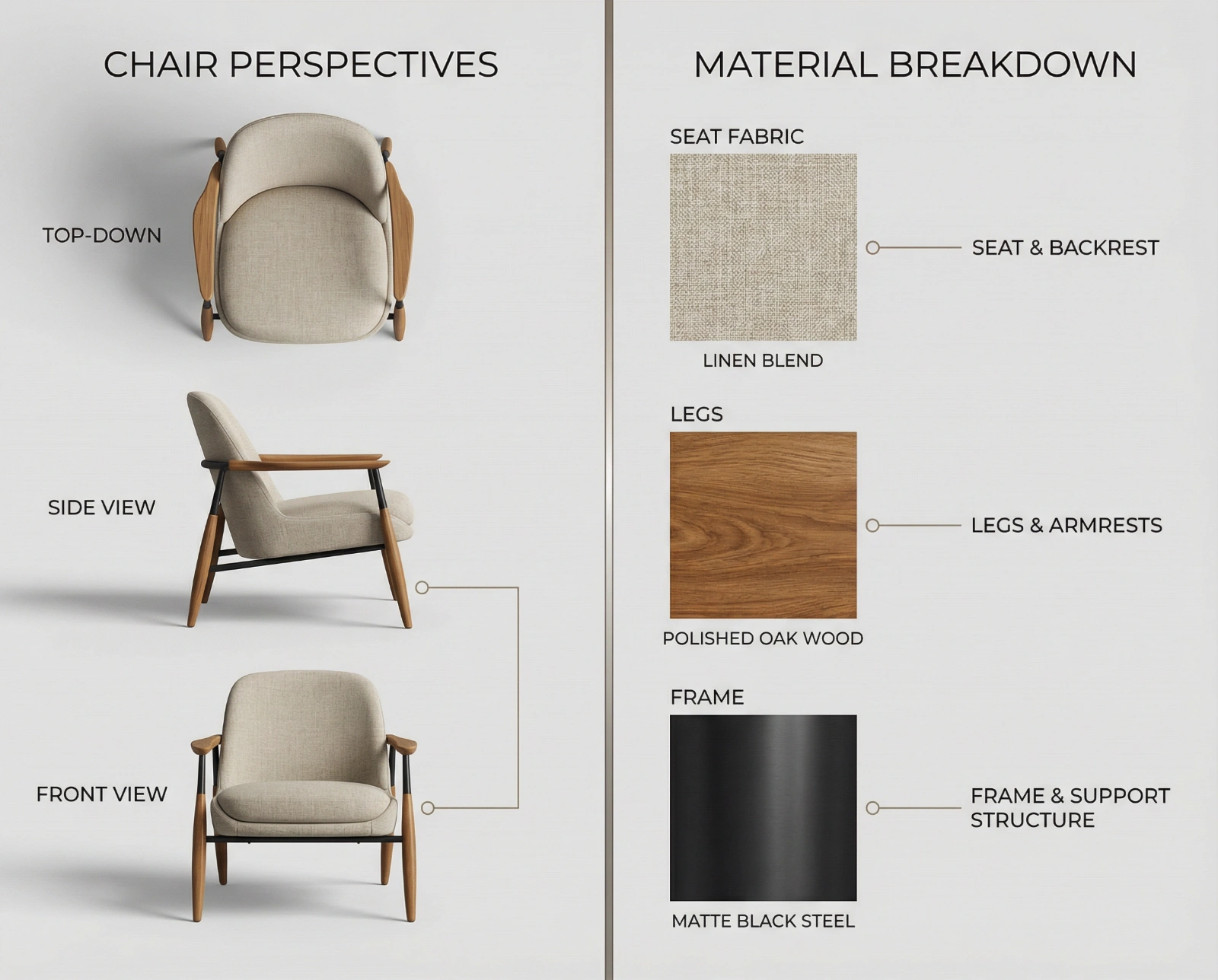 { "objective": "Create a detailed product showcase image of a chair design with multiple perspectives and material information", "image_specifications": { "style": "Realistic 3D render or high-quality product illustration", "layout": "Split view", "aspect_ratio": "3:2 or 4:3", "background": "Neutral (light gray or white) to enhance clarity and contrast" }, "left_side": { "section_title": "Chair Perspectives", "views": [ { "view": "Top-down", "description": "Display the full chair from above, showing seat shape and armrest layout" }, { "view": "Side view", "description": "Profile of the chair to show leg design, seat height, and backrest angle" }, { "view": "Front view", "description": "Straight-on view to show width, symmetry, and front structure" } ], "visual_style": "Consistent lighting and shadows for realism, subtle shadows to define form" }, "right_side": { "section_title": "Material Breakdown", "content": [ { "material": "Seat Fabric", "material_type": "Linen blend", "swatch_image": "Small fabric texture sample shown", "label_style": "Clean sans-serif text with arrows pointing to chair sections" }, { "material": "Legs", "material_type": "Polished oak wood", "swatch_image": "Close-up wood grain sample", "label_style": "Consistent labeling with visual connection to perspective images" }, { "material": "Frame", "material_type": "Matte black steel", "swatch_image": "Small metallic texture sample", "label_style": "Minimalist annotations" } ] }, "visual_elements": { "separation": "Vertical dividing line or subtle split background", "color_palette": "Natural tones for materials, grayscale for background and lines", "typography": "Modern, readable font for labels and section titles" }, "output_format": { "type": "Image", "high_resolution": true, "use_case": ["Product sheet", "Interior design catalog", "Furniture showcase"] } }