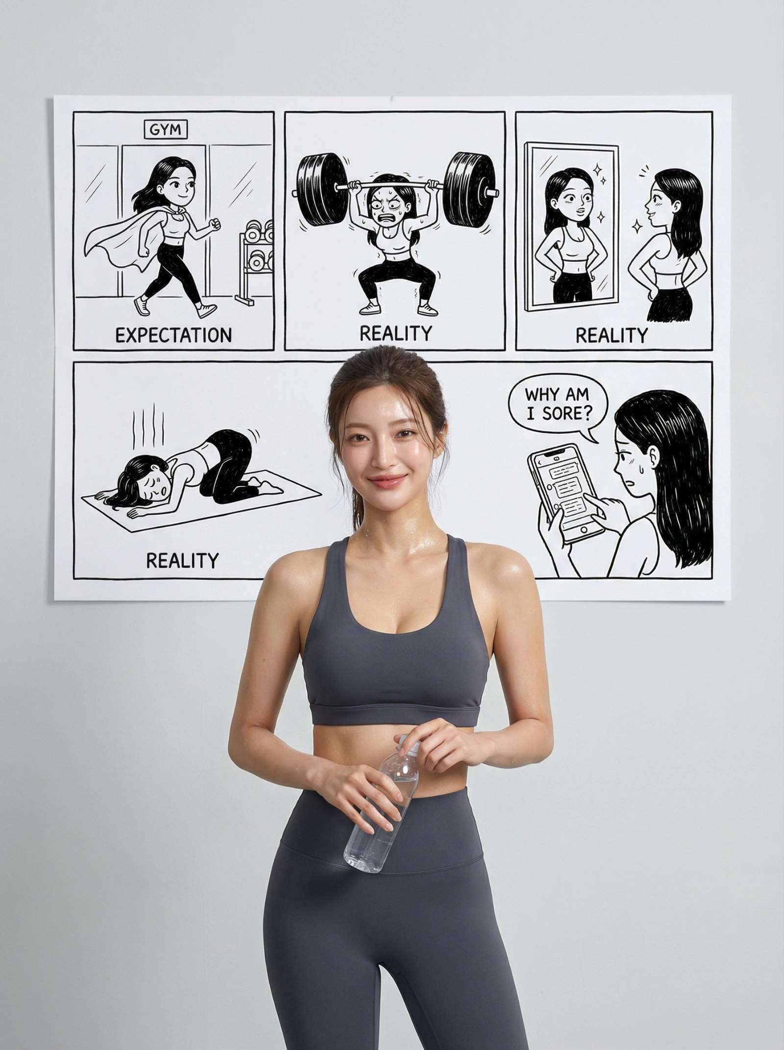 A photorealistic woman wearing modern athletic wear, holding a water bottle, slight post-workout glow, confident yet relaxed expression. Clean studio-style lighting, sharp realism, no stylization on the real subject. Behind her, a black-and-white comic strip shows her exaggerated cartoon self: – confidently entering the gym – struggling with heavy weights – checking herself in the mirror – collapsing dramatically on a yoga mat – googling “why am I sore?” on her phone The contrast emphasizes expectation vs reality, with the real woman standing as the composed outcome.