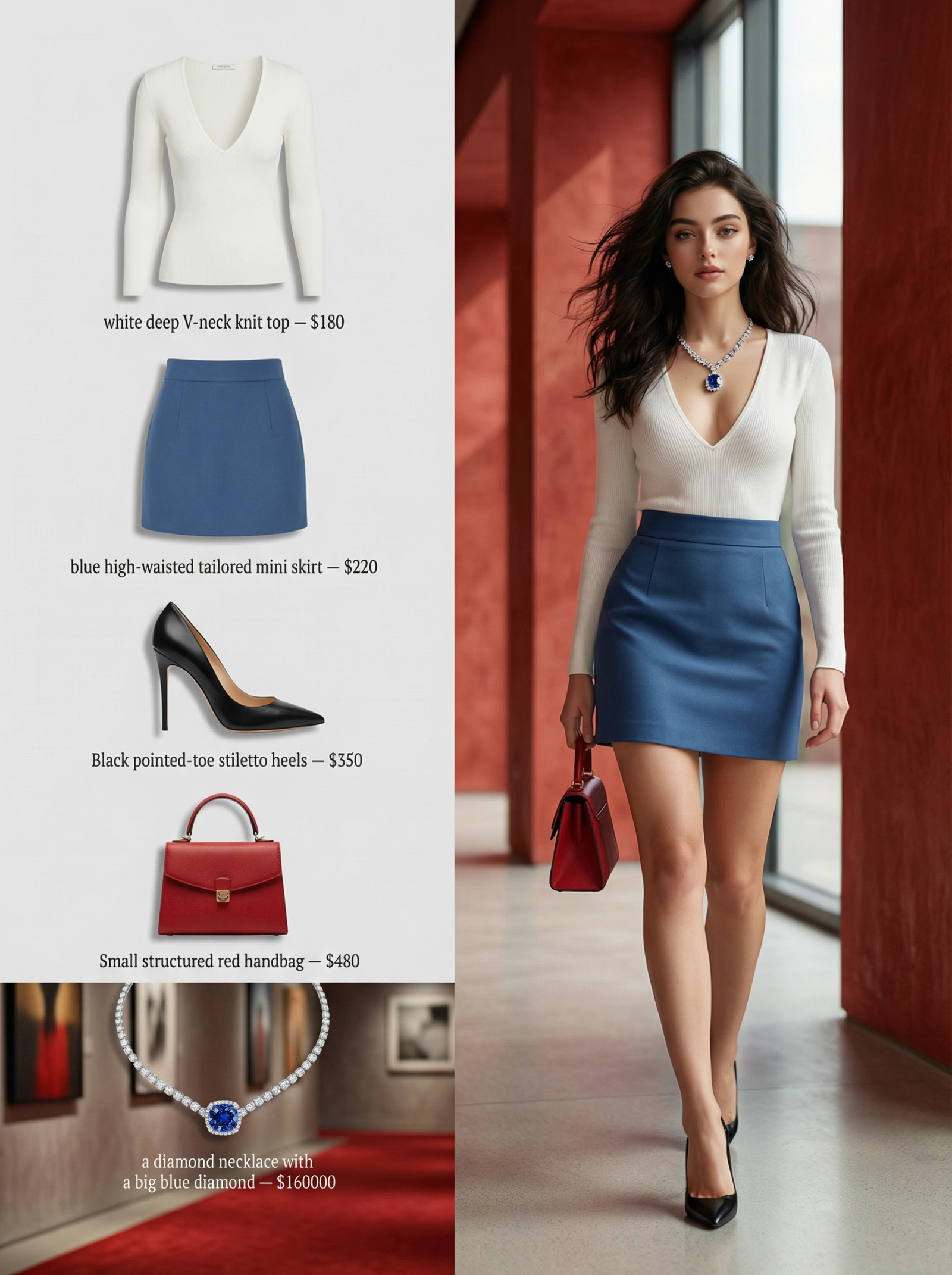 A refined fashion editorial image with a 3:4 aspect ratio, split into two clear sections. Right side: A fashionable, confident, sensual woman standing and walking casually in a modern architectural space with red luxurious walls and soft natural light. She wears a top with a deep V neckline, a 90-60-90 figure, tucked into a high-waisted blue tailored short skirt, On her feet are sleek black stiletto heels, elegant and minimal. She carries a small structured red handbag in one hand and she is wearing a luxurious diamond necklace with a blue diamond on it. Her hair is open emphasizing her facial structure. She wears subtle statement earrings. The look is refined, modern, and effortlessly chic. Natural daylight, soft shadows, realistic skin texture. Casual fashion photography style with an editorial, high-end feel. alive color palette, warm tones, shallow depth of field, cinematic realism. Style & Mood: Modern elegance, quiet luxury, confident, minimal, editorial casual. Photography Details: Eye-level angle, candid stance, 35mm lens, natural lighting, high detail, photorealistic. Left side: A clean, minimalist product breakdown layout on a neutral background. The individual fashion items worn by the woman are displayed separately, neatly arranged with subtle shadows. Each item includes a small, elegant price label in refined sans-serif typography: – white deep V-neck knit top — $180 – blue high-waisted tailored mini skirt — $220 – Black pointed-toe stiletto heels — $350 – Small structured red handbag — $480 – a diamond necklace with a big blue diamond — $160000 The left side feels like a luxury fashion catalog or e-commerce lookbook, with a red carpet, luxurious walls, art pieces on wall Overall Style & Mood: Quiet luxury, modern elegance, editorial fashion, high-end retail aesthetic. Lighting & Quality: Soft natural light, studio-clean clarity on product side, photorealistic, ultra-high resolution, professional fashion photography. Negative Prompt: Cluttered layout, oversized text, flashy logos, mannequins, people on left side, harsh lighting, low resolution, cartoon style.