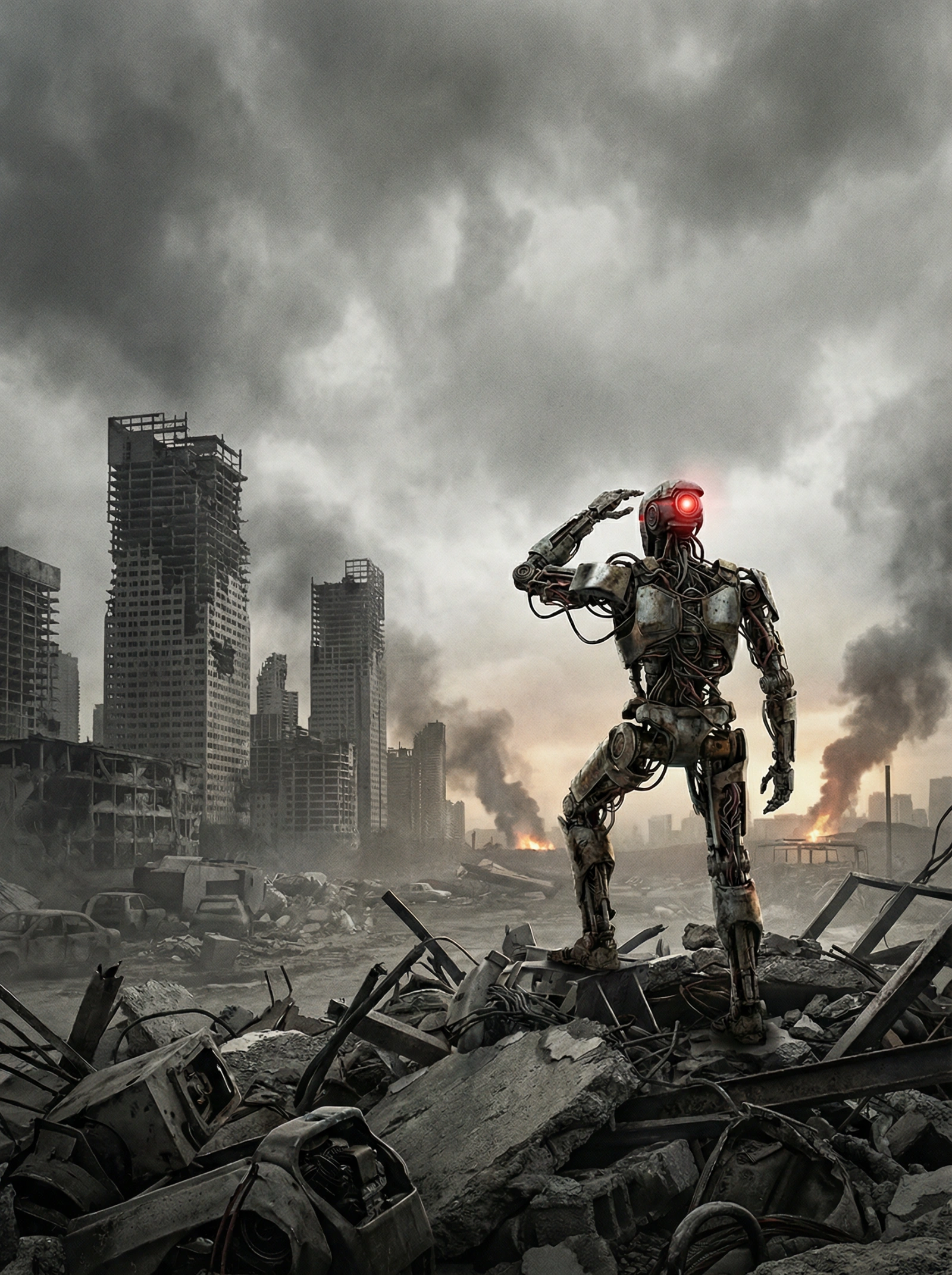 Depict the aftermath of a robot uprising in a ruined city. The foreground features a damaged, menacing combat robot standing atop a pile of rubble, scanning the horizon with a glowing red eye sensor. The background shows the skeletal remains of skyscrapers, smoke rising from fires, and an overcast, ash-choked sky. The aesthetic is grim and desaturated, with the only color coming from the robot's sensors and distant fires.