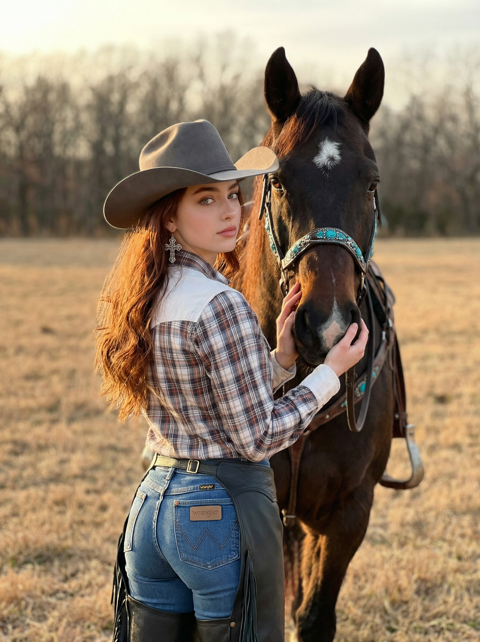 { "subject": { "description": "Young woman with long, wavy reddish-brown hair reaching past her mid-back.", "features": "Pale skin, soft youthful facial features, looking back over her left shoulder directly at the viewer with a calm, serious, and captivating expression.", "pose": "Standing with her back mostly to the camera, torso slightly twisted. Her hands are gently cupping and caressing the face/muzzle of a dark brown horse standing intimately beside her right side." }, "attire": { "headwear": "Grey felt cowboy hat with a wide brim, textured felt material.", "upper_body": "Plaid long-sleeve western shirt (light cream/beige base with red and grey check pattern), featuring a distinctive white western yoke design on the back shoulder.", "lower_body": "Classic blue denim jeans, tight-fitting, with a visible tan leather 'Wrangler' patch on the back right pocket.", "accessories": "Large, ornate silver cross earrings dangling; silver bangles/bracelets on the right wrist; black leather shotgun chaps worn over jeans with white lace ties or fabric hanging from the back waist belt.", "styling": "Authentic western cowgirl aesthetic, rugged yet feminine styling." }, "animal": { "type": "Horse", "appearance": "Dark bay or brown horse, sleek coat.", "details": "White star marking on the forehead.", "tack": "Intricate western bridle featuring a browband and cheek pieces embellished with turquoise stones and silver conchos; rope reins attached to the bit." }, "environment": { "setting": "Rural outdoor field or pasture.", "ground": "Dry, golden-brown grass indicating autumn or winter.", "background": "Blurred forest line with leafless trees, creating a soft, textured backdrop that suggests a crisp, cold day." }, "lighting": { "type": "Soft natural light, reminiscent of golden hour or late afternoon.", "quality": "Warm, diffused sunlight coming from the left, highlighting the waves in her hair and the texture of the horse's face.", "shadows": "Gentle, natural shadows providing depth to the clothing folds and facial features." }, "camera_details": { "shot_type": "Medium shot from a rear-quarter angle.", "focal_length": "85mm or 50mm portrait lens.", "aperture": "f/1.8 to f/2.8 for shallow depth of field (bokeh) to separate subject from background.", "composition": "Rule of thirds, focusing on the connection between the girl's eyes and the horse." }, "mood": { "atmosphere": "Nostalgic, serene, rustic, intimate connection between human and animal.", "color_palette": "Earthy tones: browns, beiges, creams, muted greens, and soft warm skin tones." }, "photorealism": { "quality": "High fidelity, 8k resolution, cinematic lighting.", "textures": "Hyper-realistic rendering of denim fabric, felt hat texture, horse hair, leather grain, and individual strands of human hair." } }