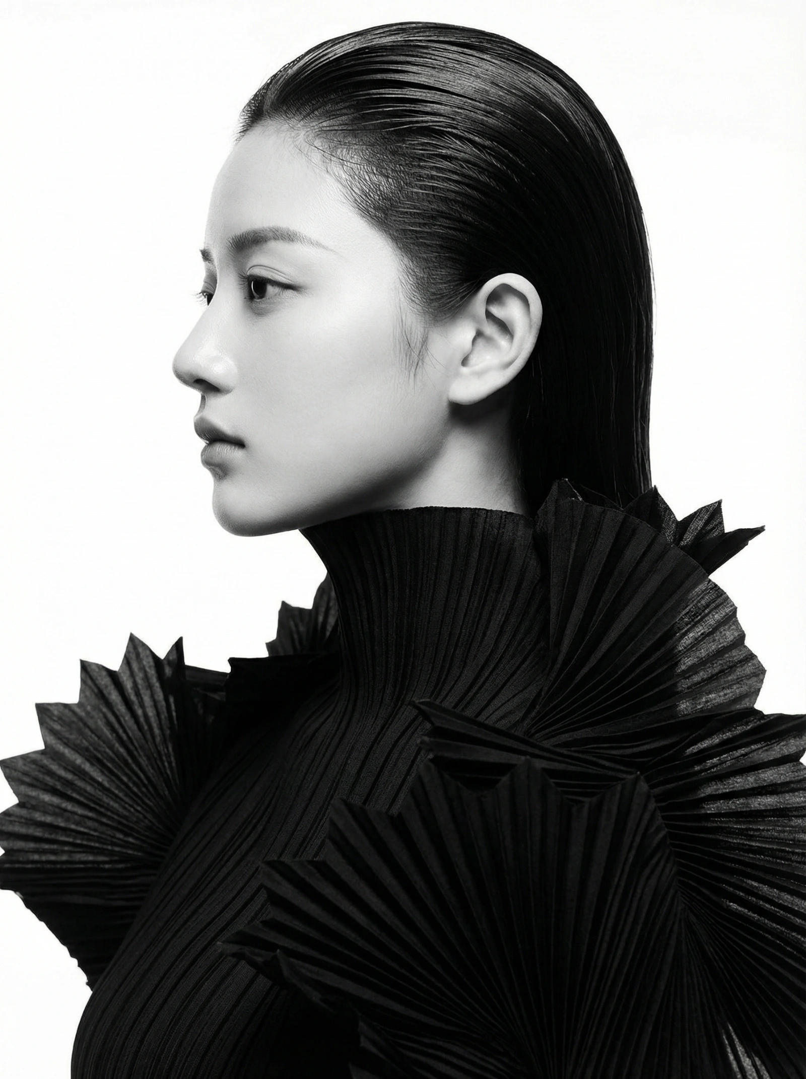 { "type": "image_generation_prompt", "concept": { "description": "A dramatic, almost sculptural high-fashion portrait focusing on extreme silhouette and form. The subject is wearing an architectural, pleated garment that obscures the body shape. The lighting is top-down (Paramount/Butterfly), carving out cheekbones and creating deep drama, treating the subject like a modern art statue.", "mood": "dramatic, artistic, intense, surreal", "color_theme": "stark black and white (or deep charcoal monochrome)" }, "subject": { "gender": "female", "identity_preservation": { "use_reference_image": true, "alter_face": false, "notes": "Maintain identity, but facial features will be heavily sculpted by shadows." }, "pose": { "name": "Statuesque", "head_position": "turned completely in profile", "eyes": "looking straight ahead (in profile)", "expression": "stoic, empty, powerful", "highlight": "strong highlight on the bridge of nose and top of cheekbone" }, "appearance": { "hair": { "style": "slicked down completely tight to the skull, almost invisible", "lighting_effect": "glossy, almost metallic sheen" }, "clothing": { "shirt": "sculptural pleated top (Issey Miyake style)", "fabric": "stiff, permanent pleats in matte black polyester", "collar": "high, exaggerated structured neck", "details": { "shape": "clothing forms geometric spikes or fans around shoulders", "texture": "intricate repeating pleat pattern" } }, "accessories": "none, the clothing is the accessory" } }, "camera_settings": { "camera": "Phase One IQ4 Achromatic (B&W Sensor)", "lens": "120mm Macro", "aperture": "f/11", "iso": 100, "shutter_speed": "1/125s", "framing": "tight bust portrait, profile view, 4:5", "resolution": "Ultra-HD 8K", "focus": "razor sharp on the profile edge and clothing pleats" }, "lighting": { "type": "aggressive top-down beauty dish with grid", "background": "pure seamless white cyclorama (blown out)", "effects": [ "extreme facial sculpting", "butterfly shadow under nose", "high drama contrast" ] }, "visual_style": { "genre": "avant-garde fashion", "contrast_level": "extreme", "tone": "cold, artistic", "keywords": ["sculptural", "high fashion", "profile", "architectural"] }, "output_goal": "Generate a stark, architectural fashion portrait in B&W, using dramatic lighting to emphasize the geometric forms of an avant-garde garment and the subject's profile." }