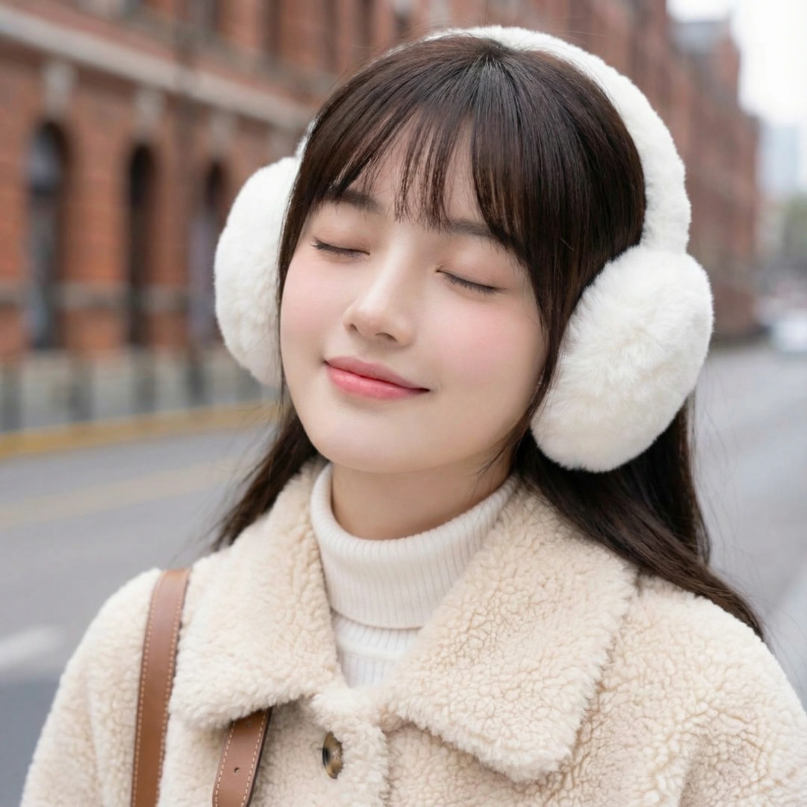 A close-up portrait of a young woman with her eyes closed and a calm, peaceful expression. She has fair skin with rosy cheeks, soft pink lips, and dark brown hair with straight bangs. She’s wearing a cream-colored teddy faux-fur coat over a white ribbed turtleneck, with a brown shoulder strap visible, and large fluffy white earmuffs. The background is a softly blurred urban street with muted reds and greys. The lighting is soft, natural daylight, creating a dreamy, serene winter mood with a shallow depth of field and a realistic, high-detail look.