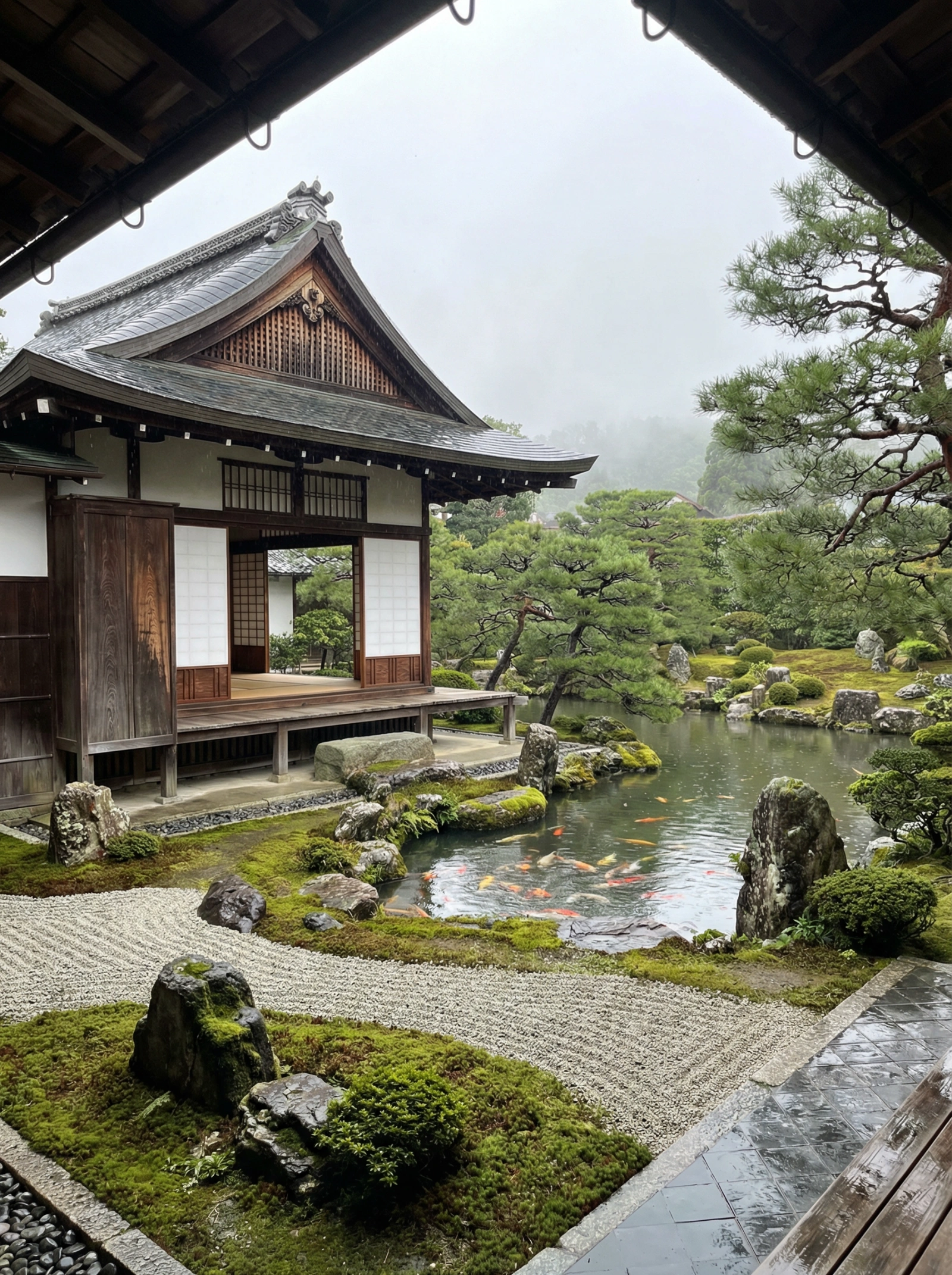 Create a serene image of a traditional Japanese Zen garden. A wooden temple pavilion with sliding shoji screens overlooks a calm pond filled with Koi fish. The garden features meticulously raked gravel, moss-covered stones, and manicured pine trees (niwaki). The lighting is soft and diffused, perhaps an overcast day, emphasizing the textures of the moss and wood. The composition should be balanced and asymmetrical.