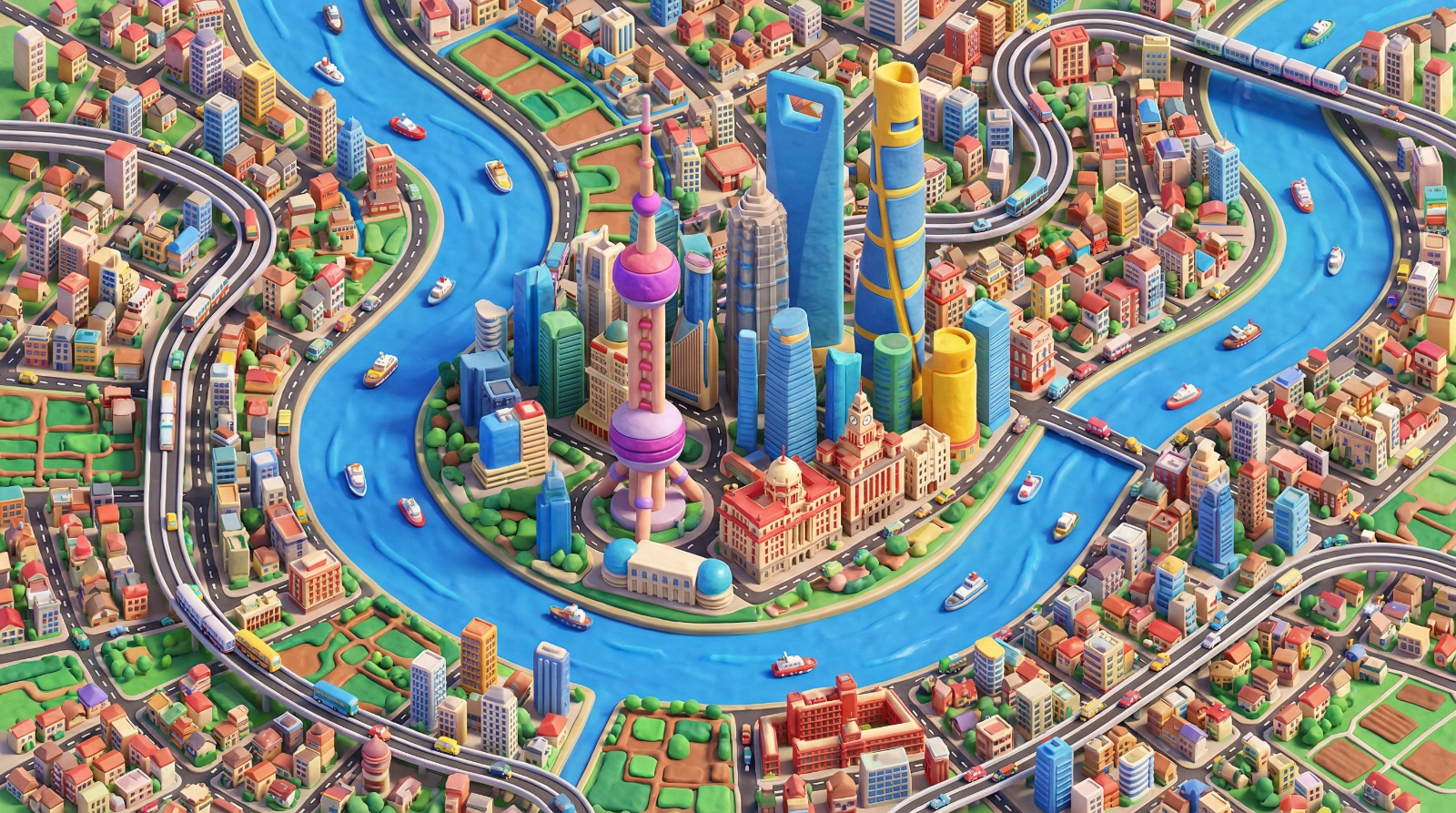 CITY_NAME = Shanghai Isometric illustration, huge map of {CITY_NAME}, wide angle aerial view, claymorphism style, toy-like miniature world. CENTER: Iconic landmarks of {CITY_NAME} rendered in exaggerated scale, positioned prominently to define the city center. GEOGRAPHY: The city's main geographic structure (such as a winding river, a coastline, or a major highway system) cutting through the composition to create visual flow. SURROUNDINGS: Extremely dense cityscape, hundreds of tiny colorful residential buildings, complex winding roads, busy traffic with tiny toy cars. ATMOSPHERE: Vibrant high saturation colors, cute, playful, rich details, crowded composition, soft smooth textures, ambient occlusion shadows, sunny daylight.