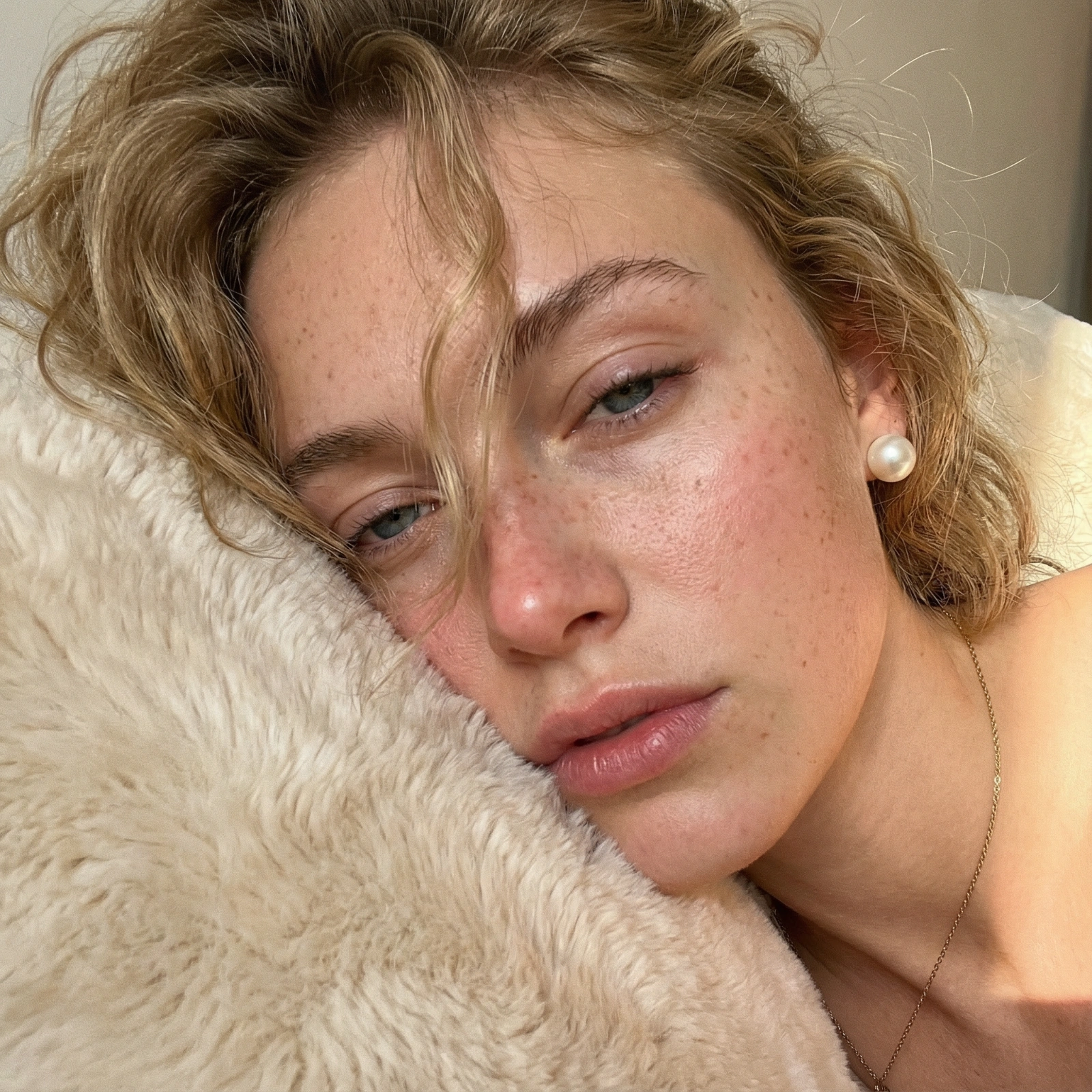 A hyper-realistic, extreme close-up POV selfie of the same woman from the reference photo, lying down and pressing her left cheek into a fluffy cream-colored faux-fur pillow that gently squishes against her face. Her head is tilted to the right as she gazes softly toward the camera with a sleepy, sultry, intimate expression — half-closed, heavy-lidded eyes and slightly parted lips.Her hair appears naturally messy in a relaxed “bedhead” state, with wispy strands falling across her forehead and partially over her left eye, without altering its original appearance from the reference. She has dewy, glowing skin with visible natural texture, a cold-girl makeup aesthetic featuring soft rosy blush on the nose tip and cheeks, subtly blurred pink-toned lips, and neatly groomed brows. She is wearing a single large white pearl stud earring on her exposed ear and a very thin, delicate gold chain necklace, with one bare shoulder visible. The scene is lit by soft, warm directional window light coming from the right, creating a golden-hour glow with gentle shadows on the left side of her face and highlights along the bridge of her nose, cheekbone, and lower lip. Shot on an iPhone front-facing camera at 23mm, f/2.2, from a high-angle selfie perspective with shallow depth of field and soft bokeh. Finished with a VSCO C1 or G3-style filter — warm tones, slightly desaturated blacks, subtle film grain, low contrast — creating a dreamy, hazy, lazy Sunday morning atmosphere.