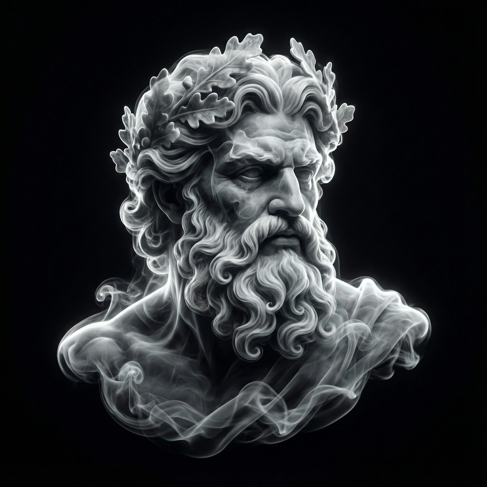 A bust portrait of a Greek god (Zeus) sculpted entirely from swirling white cigarette smoke against a pitch-black background. The form is defined only by the density of the smoke. Dramatic rim lighting to highlight the edges of the vapor.
