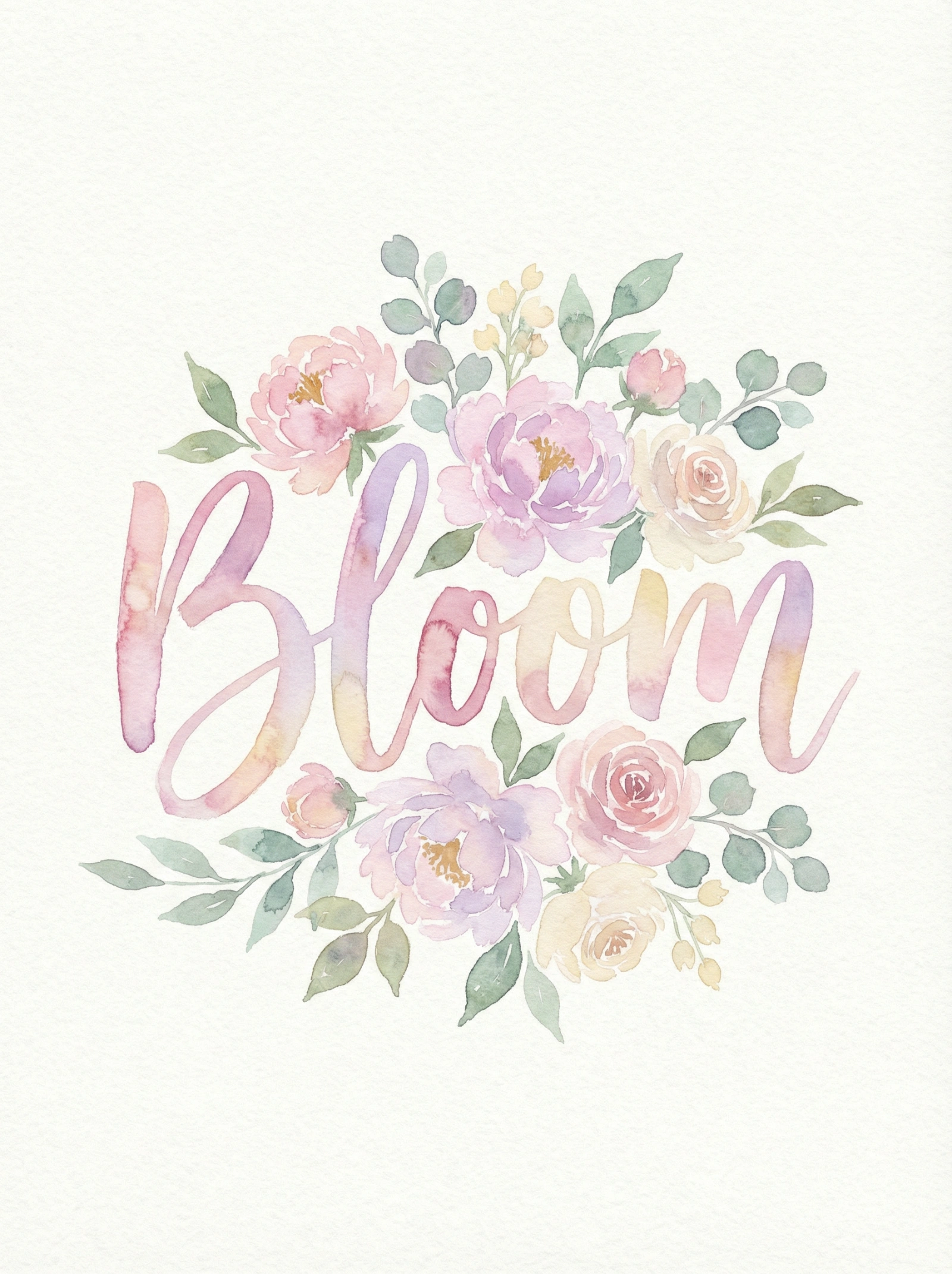 Generate a watercolor logo for florist "Bloom." Soft pastels. Brush-painted text with bleed edges.