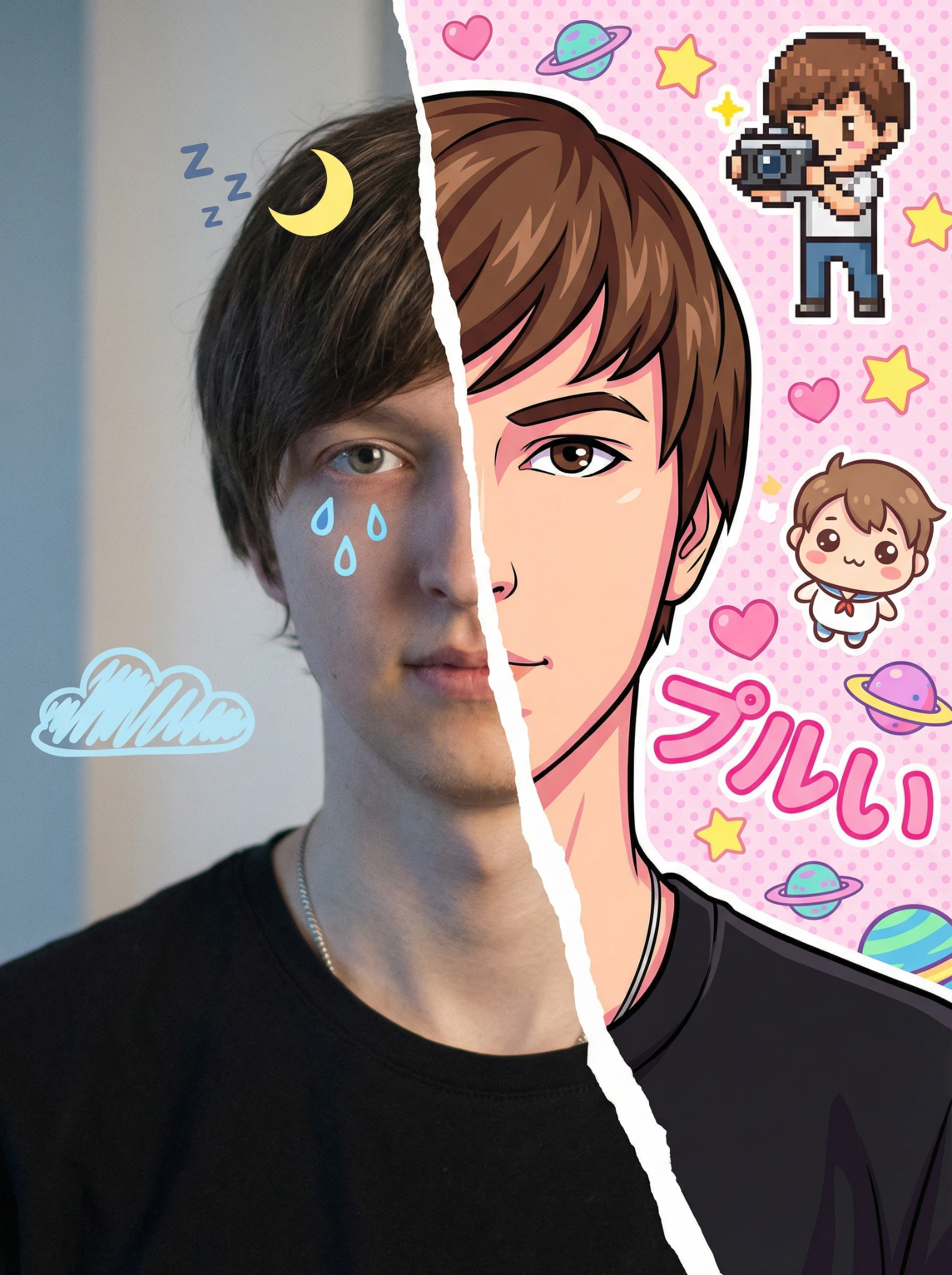 Prompt: { "image_generation": { "requirements": { "face_preservation": { "preserve_original": true, "accuracy_level": "100% identical to reference", "details": [ "real facial proportions", "exact skin texture", "true eye shape and color", "natural lighting on skin", "subtle clean look" ] }, "pose": { "match_reference_pose": true, "description": "Chest-up portrait, face facing forward but gently tilted to the right from the viewer’s perspective." }, "lighting": { "match_reference_lighting": true, "type": "soft diffused indoor lighting", "direction": "from the front and slightly from the left", "shadows": "soft shadows along jawline and neck", "background_tone": "soft neutral with slight bluish tint" } }, "subject": { "gender": "male", "hairstyle": { "match_reference": true, "description": "same exact hairstyle as in the reference image" }, "expression": "neutral, slightly thoughtful", "clothing": { "top": "simple black T-shirt", "accessory": "thin silver chain necklace" } }, "composition": { "frame": "chest-up portrait", "orientation": "frontal with slight rightward tilt", "style": "hyper-realistic with split real/cartoon effect" }, "special_effects": { "split_effect": { "type": "irregular centered tear", "edges": "white angled torn-paper texture", "description": "image appears ripped down the middle" }, "realistic_side": { "background": "soft, neutral, slightly bluish environment", "filters": [ "soft analog grain", "light vintage texture", "reduced saturation", "subtle film imperfections" ], "overlays": [ "blue stylized teardrop stickers below the left eye", "small 'Zzz' sleep symbols near forehead", "yellow crescent moon in the upper-left", "light blue hand-drawn cloud" ] }, "illustrated_side": { "art_style": "bold cartoon, digital illustration", "color_palette": "bright, vibrant, saturated", "hair": "same tone as the realistic side but stylized", "eyes": "sharper cartoon eyes with bold lines", "background": "vibrant light pink pop-art style", "decorations": { "kawaii_elements": [ "pixel-art character holding a camera", "cute chibi mascot", "yellow stars", "pink hearts", "colorful planets", "bold pink Japanese characters" ] } } }, "aesthetic": { "overall_tone": "soft, dreamy, lightly vintage", "lighting_consistency": "must match reference perfectly", "skin_texture_realism": "high", "blending_quality": "smooth natural transition between real and illustrated halves with crisp tear edge" }, "output": { "style": "hyper-realistic + digital cartoon fusion", "quality": "ultra-high-resolution", "filters": [ "subtle analog vintage film filter", "soft grain" ] } } }