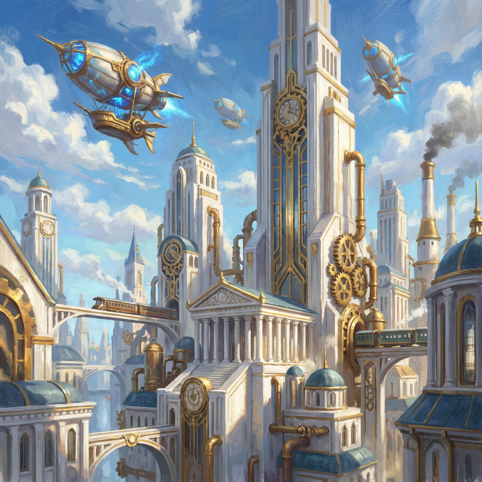 A majestic view of a steampunk city made of white marble and gold metal. Hextech airships float in the blue sky. The architecture is Art Deco meets fantasy technology. The image looks like a digital painting with visible texture strokes. Bright and optimistic lighting.