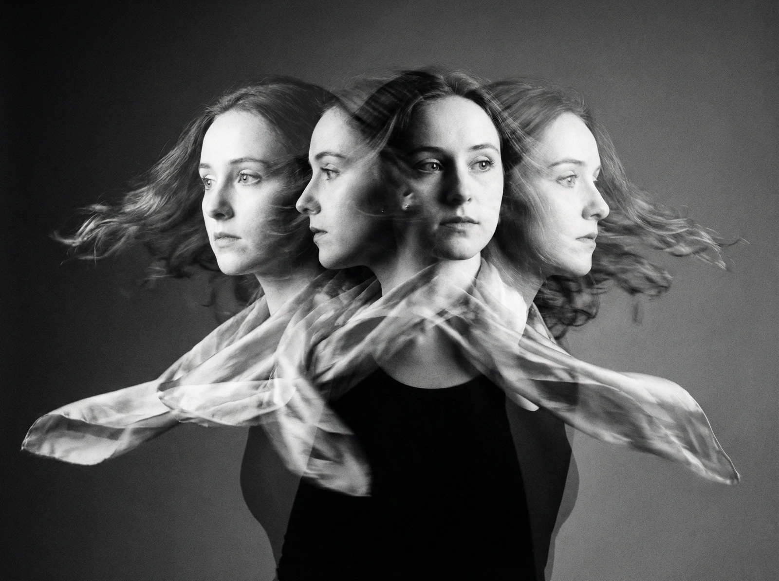 Create a portrait showing multiple stages of movement in one frame, like a stroboscopic photo of a dancer moving their head.