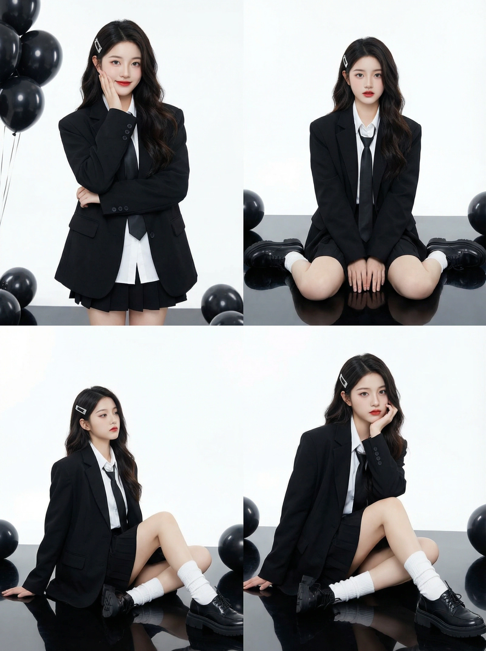 "Young Asian woman, pale porcelain skin, long dark wavy hair with side bangs.", "accessories": "A silver rectangular hair clip on the left side of the head.", "apparel": { "outerwear": "Oversized black structured blazer (suit jacket).", "inner": "White collared button-up shirt, loose black necktie.", "bottoms": "Black pleated mini skirt (mostly obscured by the oversized blazer).", "legwear": "White loose slouch socks (leg warmers style) scrunching at the ankles.", "footwear": "Black chunky leather platform derby shoes." }, "makeup": "K-pop/Douyin style: fair skin, soft gradient red lips, subtle blush, defined eyeliner." "2x2 Photo Collage (4-Panel Grid).", }, "environment_and_props": { "studio_setting": "High-key photography studio.", "background": "Seamless bright white backdrop.", "flooring": "Glossy black reflective floor (creating clear reflections of the shoes and legs).", "props": "Cluster of black helium balloons (matte and glossy finish) visible in the top-left and scattered on the floor in other panels." }, "panel_pose_breakdown": { "panel_1_top_left": { "framing": "Thigh-up shot.", "pose": "Standing straight. Left hand rests gently against the left cheek (palm facing jaw). Right arm hangs naturally by side. Head tilted slightly.", "gaze": "Looking directly at camera with a soft smile.", "prop_placement": "Black balloons floating in the top left corner." }, "panel_2_top_right": { "framing": "Full body, seated.", "pose": "Sitting on the floor with knees bent upwards and feet flat on the ground. Hands resting loosely on the floor between legs or on shins.", "gaze": "Direct eye contact, neutral expression.", "details": "Symmetrical composition." }, "panel_3_bottom_left": { "framing": "Full body, seated angle.", "pose": "Sitting on the floor, leaning torso back, supporting weight with both arms extended behind her. Legs bent, one knee angled higher than the other.", "gaze": "Looking slightly to the side with a cool attitude." }, "panel_4_bottom_right": { "framing": "Full body, seated.", "pose": "Sitting with legs bent to the side. Left hand is raised, touching the chin/neck area thoughtfully. Right arm extended back for support.", "gaze": "Direct eye contact, slight smirk." } }, "camera_technical_values": { "lens": "50mm to 85mm (Standard portrait lens).", "aperture": "f/8.0 (Deep depth of field, keeping the entire subject sharp against the white background).", "shutter_speed": "1/160s (Studio sync).", "iso": "ISO 100 (Clean, noise-free image).", "lighting_setup": "Softbox lighting. Large diffuse light source from the front to create shadowless, flattering illumination on the face ('Beauty Light').", "contrast": "High contrast between the black outfit and the stark white background."