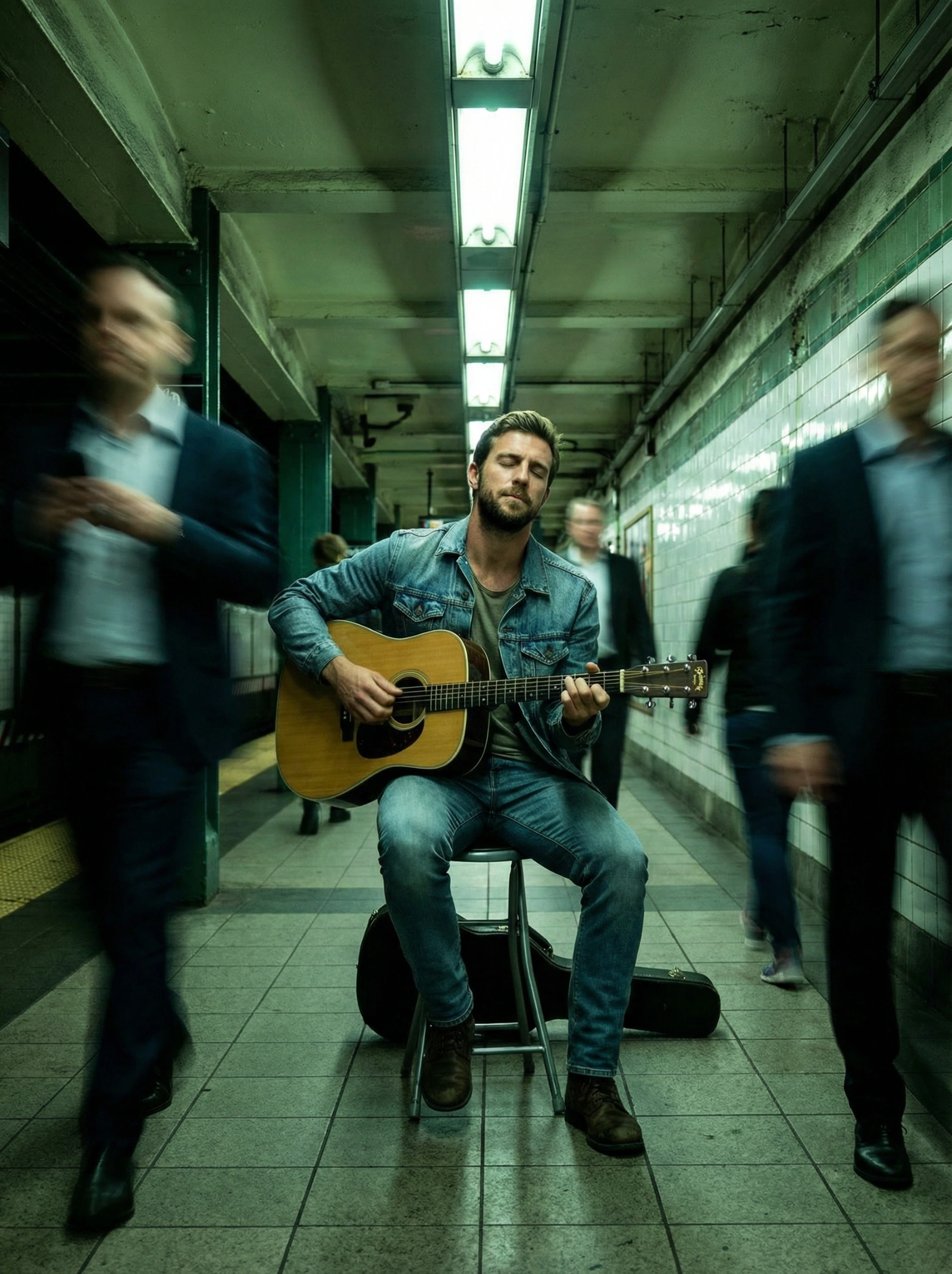 An environmental portrait of a busker playing a guitar on a subway platform. Commuters blur past in the foreground and background (long exposure). The lighting is the harsh, greenish fluorescent light of the subway station. The musician looks lost in the music.