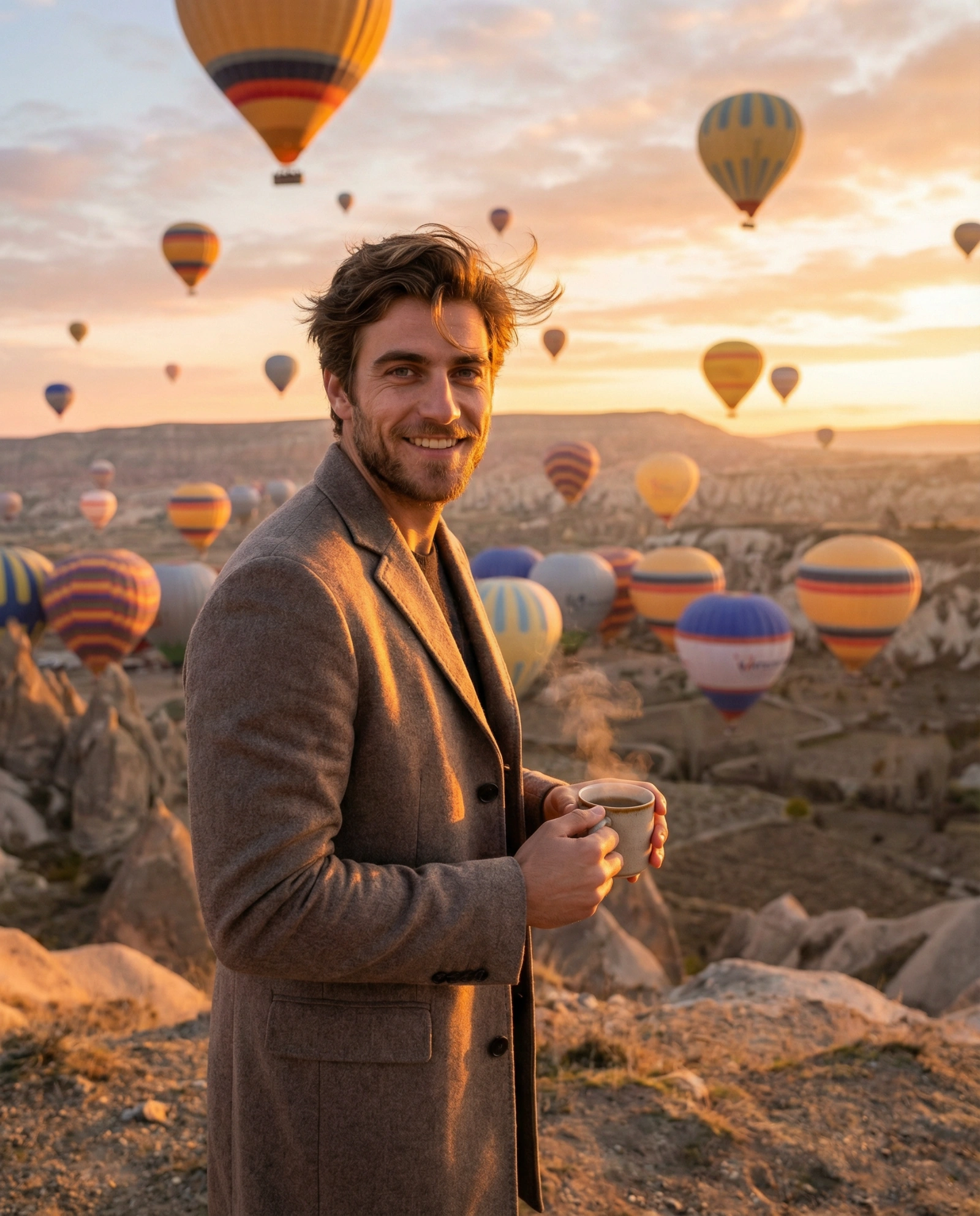 A sunrise photograph shows the person attached in the uploaded reference image (keep the face 100% accurate) standing on a hill overlooking dozens of colorful hot air balloons rising into the sky. They wear a long beige coat and hold a cup of warm tea. The wind moves their hair gently as they smile at the camera. Soft sunlight paints the balloons and the rocky landscape behind them.