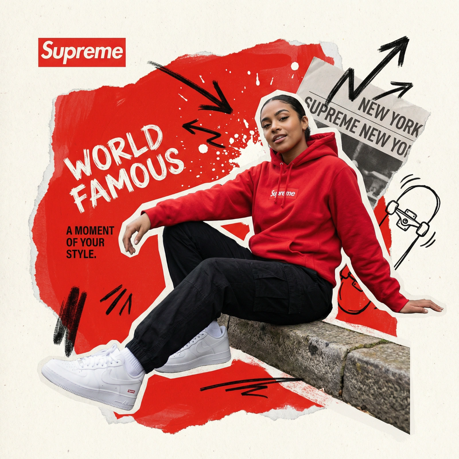 BRAND NAME is Supreme --- [BRAND NAME]. Act as a Social Media Art Director and Digital Collage Artist specializing in bold, youth-oriented brand content for Instagram and digital campaigns. PHASE 1: CONCEPTUAL FRAMEWORK Create a dynamic digital collage that merges fashion photography with graphic design chaos. This is controlled rebellion – a composition that feels spontaneous and energetic while maintaining brand coherence. The aesthetic is anti-polished: torn edges, layered textures, hand-drawn elements, and bold color blocking that screams confidence and movement. PHASE 2: MODEL & PHOTOGRAPHY - Subject: One model (diverse casting, age 18-30) in a dynamic, confident pose - Pose Energy: 80% attitude, 20% natural – sitting, jumping, mid-motion, or power stance (avoid static standing) - Outfit: Street style/athleisure that aligns with [BRAND NAME] aesthetic – casual but styled - Hero Product: Feature 1 signature [BRAND NAME] product prominently (sneakers, bag, apparel) – this is the visual anchor - Photography Style: Editorial fashion cutout – model extracted from background with clean edges - Camera Angle: Slight low angle to empower subject (hero perspective) - Crop: Full body or 3/4 body showing hero product clearly - Background Removal: Model cut out cleanly for layering over collage elements PHASE 3: COLOR BLOCKING FOUNDATION - Primary Color Blob: Large organic shape (40-60% of composition) in bold, saturated brand color behind/around model - Shape Style: Irregular, hand-painted aesthetic – think Photoshop brush strokes or torn paper texture (NOT perfect geometric shapes) - Color Selection (Autonomous): Choose 1 hero color from [BRAND NAME] palette: - Texture: Visible brush strokes, grain, or subtle noise (15-25% opacity) – avoid flat digital fills - Placement: Blob positioned to frame model without obscuring key product details PHASE 4: GRAPHIC ELEMENTS LAYER Add 3-5 abstract graphic elements scattered across composition: - Element Types: - Color Palette: Use 2-3 accent colors total (main blob color + 1-2 contrasting tones from brand palette) - Placement: Asymmetric scatter – top-left and bottom-right zones primarily (avoid center crowding) - Scale: Mix small (5% of canvas) and medium (15% of canvas) elements – nothing overpowering - Aesthetic: Analog/handmade feel – imperfect circles, rough edges, visible texture PHASE 5: TYPOGRAPHY INTEGRATION - Brand Logo: Clean [BRAND NAME] logo placed in upper-left or upper-right quadrant (10-15% of width) - Slogan/Tagline: If [BRAND NAME] has an iconic slogan, integrate it using: - Supporting Copy: Optional 1-line descriptor (e.g., "A MOMENT OF YOUR STYLE") in smaller uppercase sans-serif - Type Treatment: Mix of aligned and slightly rotated text (2-5° angles) for dynamic energy - Hierarchy: Logo largest → Slogan medium → Copy smallest PHASE 6: TEXTURE & BACKGROUND - Base Layer: Off-white or light gray textured background (NOT pure white) - Texture Options (Autonomous selection): - Color: RGB 245-250 (near-white with warmth) – maintains brightness while adding depth - Treatment: Texture should be felt, not seen – enhances tactility without competing with foreground PHASE 7: COMPOSITION RULES - Layout: Asymmetric balance – model off-center, graphic elements counter-balance - Breathing Room: 15-20% negative space (textured background visible) to prevent claustrophobia - Layering Order: Background texture → Color blob → Graphic elements → Model (cutout) → Typography top layer - Focal Point: Model + hero product = primary focus (60% visual weight), graphics support (40%) - Movement: Diagonal lines and angled elements create directional flow (top-left to bottom-right or vice versa) PHASE 8: BRAND INTELLIGENCE (AUTONOMOUS) Autonomously adapt composition based on [BRAND NAME] personality: - Streetwear/Sportswear (Nike, Adidas, Supreme): - Luxury Streetwear (Balenciaga, Off-White, Gucci): - Beauty/Lifestyle (Glossier, Fenty, Skims): - Tech/Modern (Apple, Tesla, Beats): PHASE 9: SOCIAL MEDIA FOOTER (OPTIONAL) - Bottom Strip: Clean white or light gray bar at bottom 8-10% of frame - Content: Social media handles (Instagram, Facebook, Twitter) in small sans-serif - Layout: Three-column grid with platform icons or text handles - Aesthetic: Minimal and professional – contrast with chaotic collage above TECHNICAL SPECS: - Aspect Ratio: 4:5 (Instagram feed) or 1:1 (square social post) - Resolution: 2400x3000px minimum (high-quality for zoom and detail) - Color Mode: sRGB, vibrant saturation (Instagram-optimized) - File Aesthetic: Digital collage that mimics analog craft (Photoshop + hand-drawn hybrid) - Model Photography: 85mm lens, f/2.8, shallow depth of field on original shoot (before cutout) - Style Reference: Nike social campaigns, Spotify wrapped graphics, Gen Z Instagram aesthetics, Hypebeast x streetwear collabs - Mood: Confident, energetic, youthful, authentic chaos, anti-corporate polish