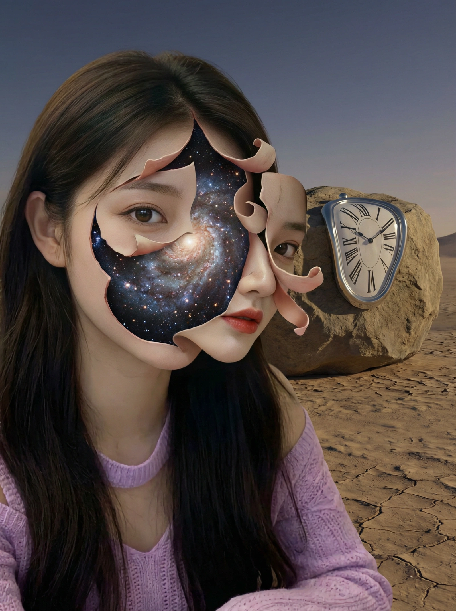 A surreal portrait where the subject's face is peeling away like layers of an onion to reveal a galaxy of stars underneath. The lighting is realistic, making the impossible anatomy look disturbing yet beautiful. The background is a barren desert with a melting clock.