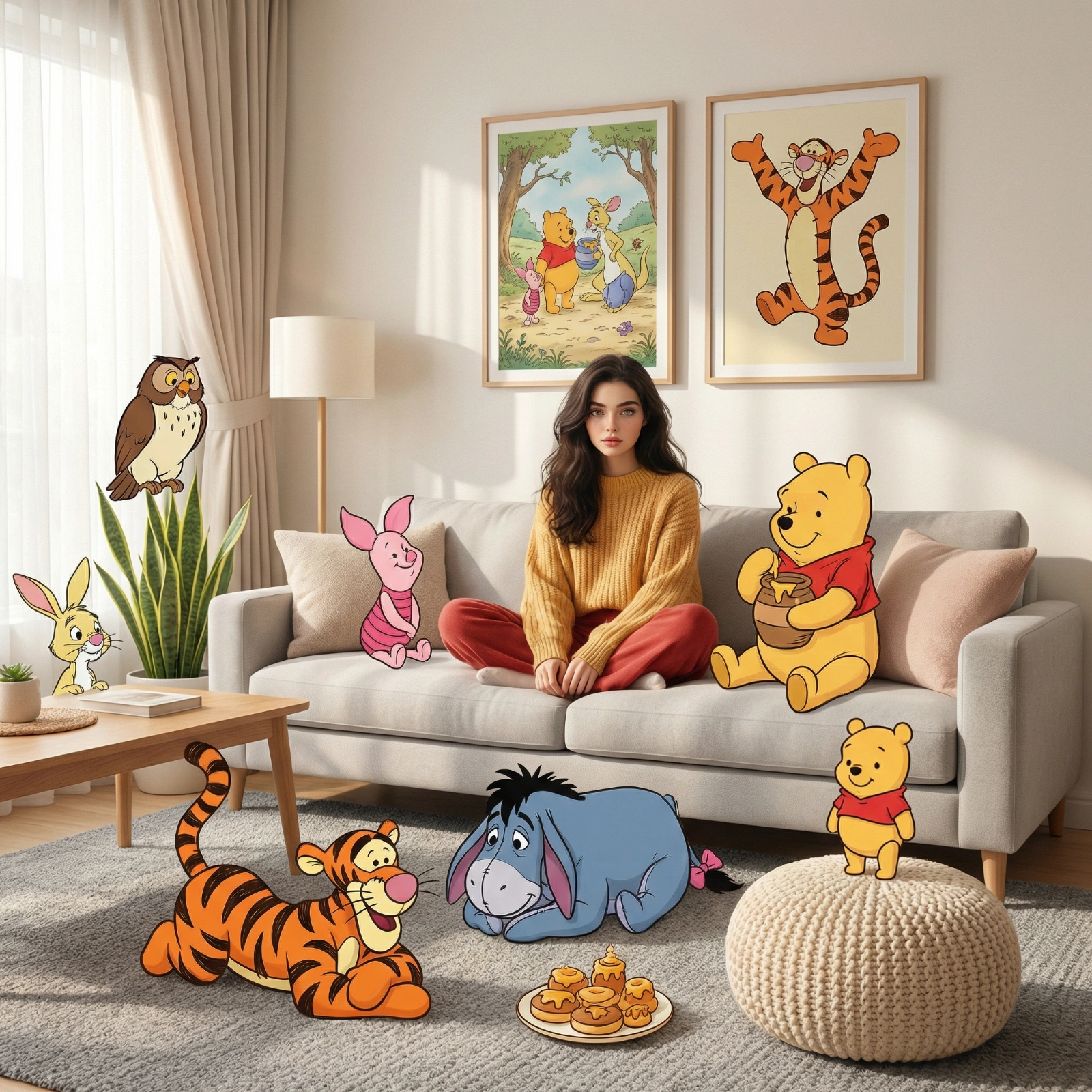 A high-fidelity, wide-angle interior shot captures a surreal mixed-media composition inside a modern living room. The main human subject uses the uploaded reference face as a strict and unchangeable identity anchor. The uploaded reference face must be preserved with extreme fidelity and accuracy. Facial structure, proportions, bone anatomy, eye shape, nose, lips, skin texture, and overall likeness must closely and clearly match the reference image. Do not alter, stylize, exaggerate, beautify, replace, or reinterpret the human face in any way. The human subject must remain fully photorealistic at all times, even when surrounded by cartoon characters. The subject wears realistic clothing whose colors are carefully chosen to harmonize with the Winnie the Pooh color palette, including warm honey yellows, soft reds, and gentle pastel tones. Clothing materials remain realistic, with natural fabric texture, while the color scheme visually blends into the cartoon world. The subject sits centrally on a plush light gray sofa. The environment blends a photorealistic 3D living room with soft, hand-drawn 2D storybook-style Winnie the Pooh characters interacting naturally with the physical space. On the right side of the sofa, Winnie the Pooh sits happily holding a honey pot. On the left side, Piglet sits shyly on a cushion. Behind the sofa, two framed posters hang on the white wall: one showing Pooh and friends in the Hundred Acre Wood, the other featuring Tigger mid-bounce. In the foreground, Tigger relaxes playfully on a textured gray carpet while Eeyore rests calmly nearby. A small plate with honey-themed treats sits on the floor. A tiny chibi-style Pooh stands proudly on a cream-colored knit pouf. Near the wooden coffee table, Rabbit observes thoughtfully, while Owl perches near a snake plant by the window. Soft natural light enters from the left through sheer curtains, with subtle volumetric lighting enhancing fabric textures, wood grain, and foliage. Rendered in 8K resolution, sharp focus, warm pastel colors, dreamy and wholesome cinematic atmosphere. Seamless blend of real world and cartoon world, no AI visible. Negative prompt: no face distortion, no face replacement, no stylized human face, no cartoon human, no anime human, no altered identity