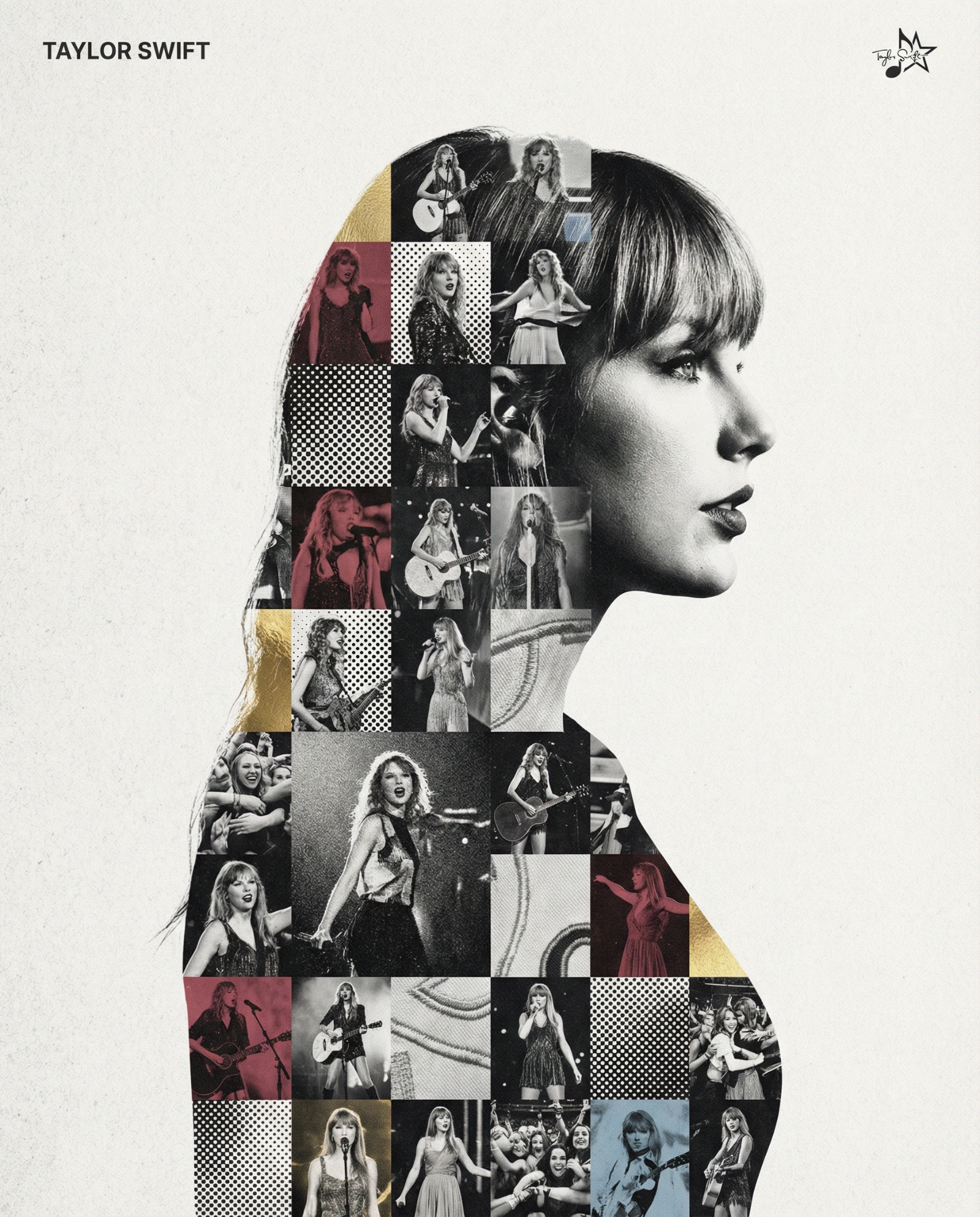 [Taylor Swift]. Act as a high-end sports graphic designer creating a conceptual tribute poster. The style is a complex "dual exposure photo-grid composite" with mixed-media textures. CENTRAL STRUCTURE (THE VESSEL): The central focus is a large-scale, high-contrast black and white portrait silhouette of [PERSON NAME]. This main portrait acts as the container. THE GRID FILL & TEXTURES (MIXED MEDIA): The interior of the silhouette is populated by a dense "photo mosaic grid" of action shots from the person's career. CRITICAL TEXTURE INSTRUCTION: Do not just paste flat photos. Apply artistic textures to various grid cells to create a tactile, collage feel. Use effects like: Halftone Dots: Comic-book style raster patterns on some cells. Fabric/Embroidery: Subtle thread or canvas textures suggesting a jersey or patch. Film Grain: Heavy noise on specific high-contrast action shots. COLOR STRATEGY: The base is Monochrome B&W. Use selective color overlays (relevant to the team/flag) ONLY on specific grid cells to create a rhythm. TYPOGRAPHY & BRANDING (STRICT MICRO-SCALING): Top Left (The Name): Write "[PERSON NAME]" strictly using the font Inter Semibold. Kerning: Tight negative kerning (-4%). Size: SMALL and discreet. It must occupy MAXIMUM 20% of the canvas width. Do NOT make it large or loud. Top Right (The Symbol): Place the primary logo (Team/Brand/Flag). Size: VERY SMALL. It must occupy MAXIMUM 10% of the canvas width. COMPOSITION & BACKGROUND: Background: Off-white or light grey with a visible high-quality paper or concrete texture. It should not be flat digital white. Alignment: Center the figure perfectly. Maintain wide negative space around the object.