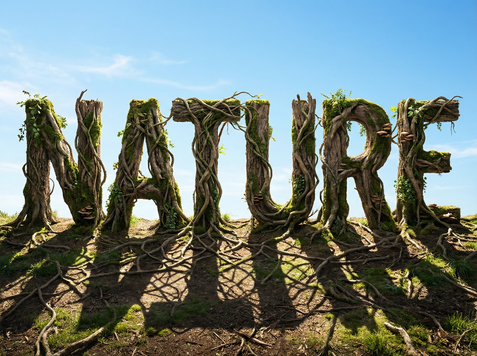 Create a 3D typographic installation of the word 'NATURE'. The letters are not solid but formed from tangled tree roots, vines, and moss. The background is a bright, clear blue sky. The sunlight casts intricate, complex shadows from the roots onto the ground. The texture of the bark and leaves should be hyper-realistic.