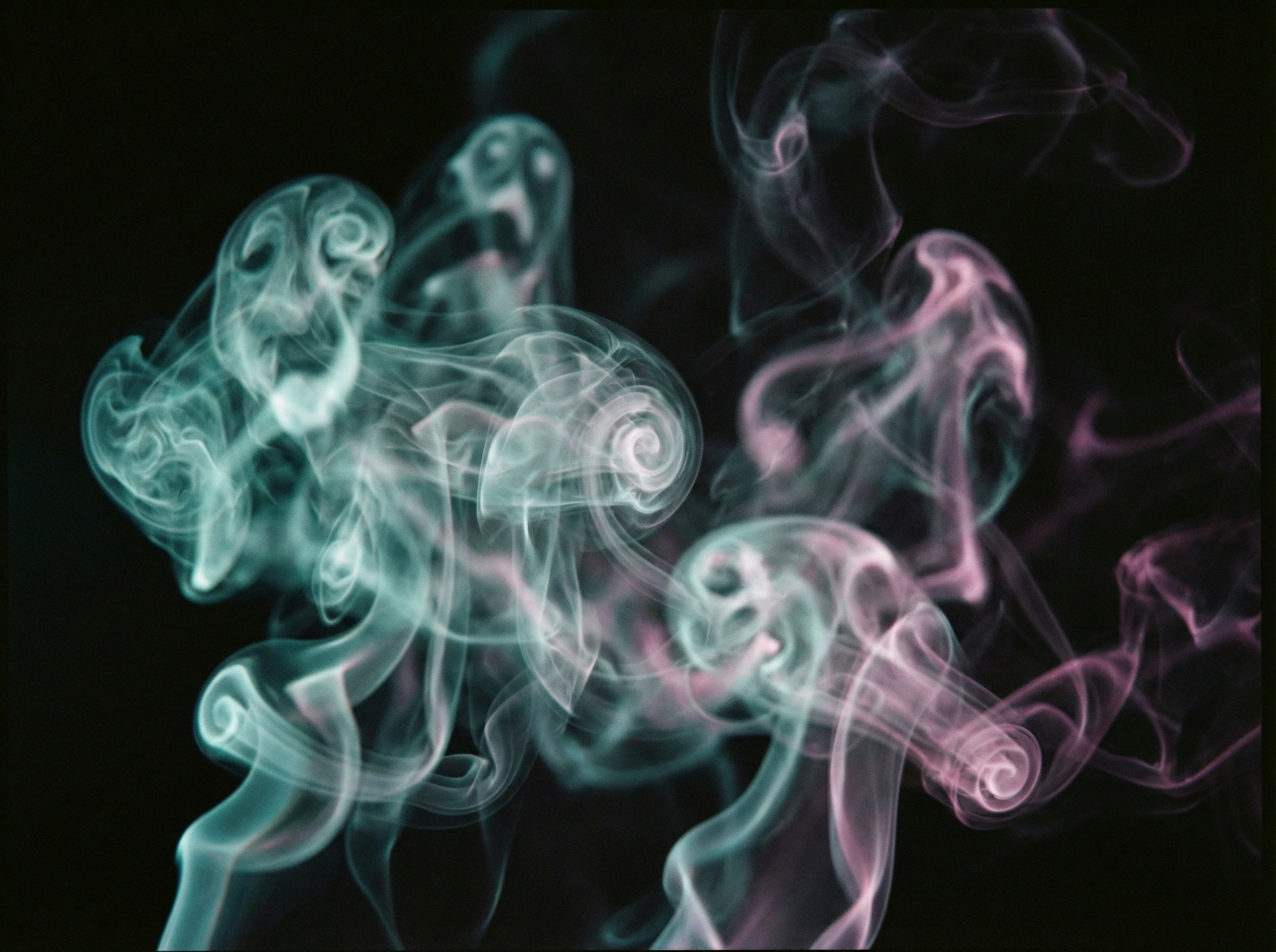 Create an abstract image of swirling smoke in a void. The smoke is bioluminescent, emitting a soft teal and magenta glow. The smoke forms vague, pareidolic shapes that look like spirits or ghosts, but remain abstract. The texture is wispy and gaseous.