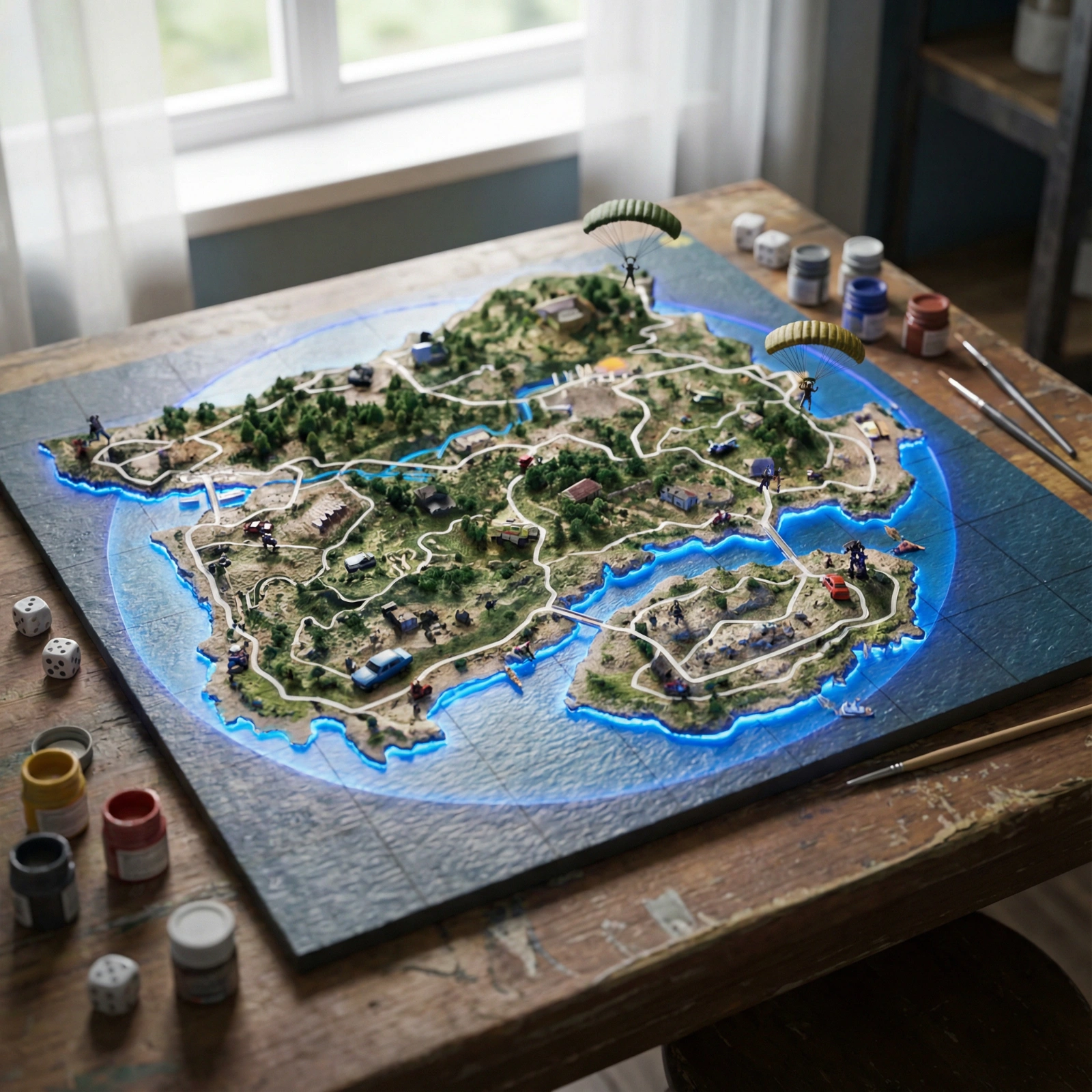 A miniature tabletop version of the iconic map from [PUBG Mobile], with tiny characters, vehicles, terrain, and interactive-looking details. Stylized realism, soft lighting, tilt-shift depth.