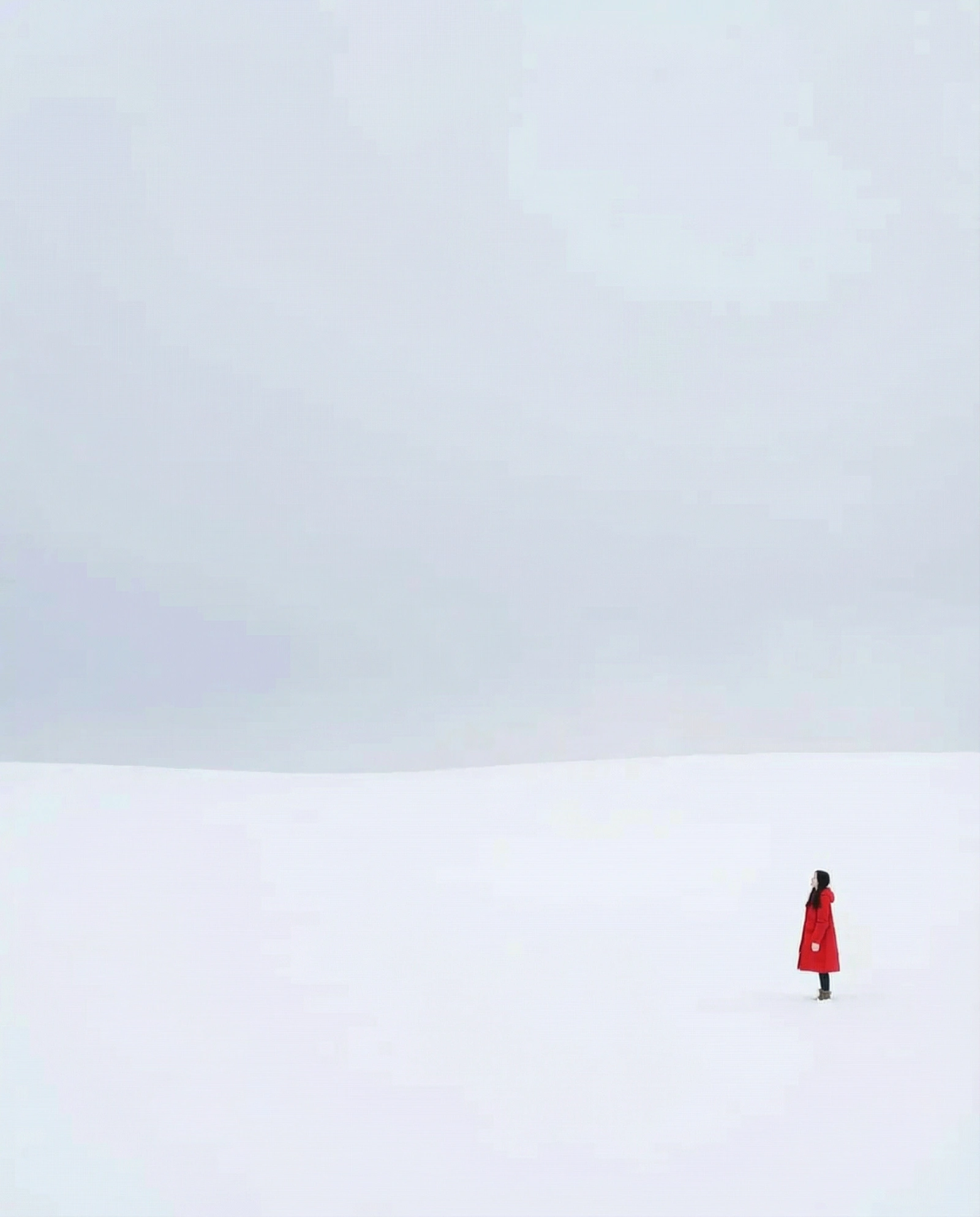A wide shot of a snowy field. A tiny figure in a red coat stands in the bottom right corner. The rest of the image is pure white snow and grey sky. Minimalism.