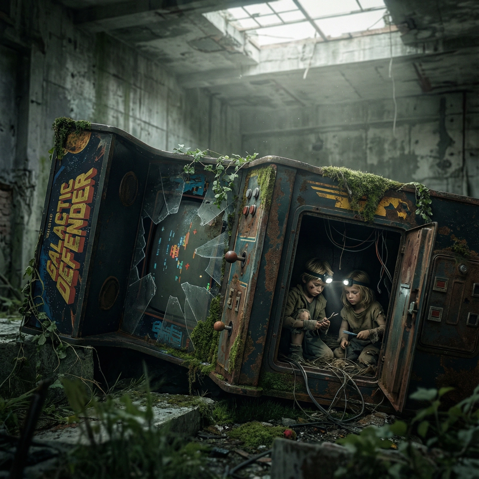 A ruined [coin-operated arcade machine] centuries after civilization has fallen. Shattered glass, oxidized control panels, moss creeping over faded pixel art. Tiny [child survivors] scavenging inside the cabinet. Moody lighting, cinematic realism, environmental storytelling.