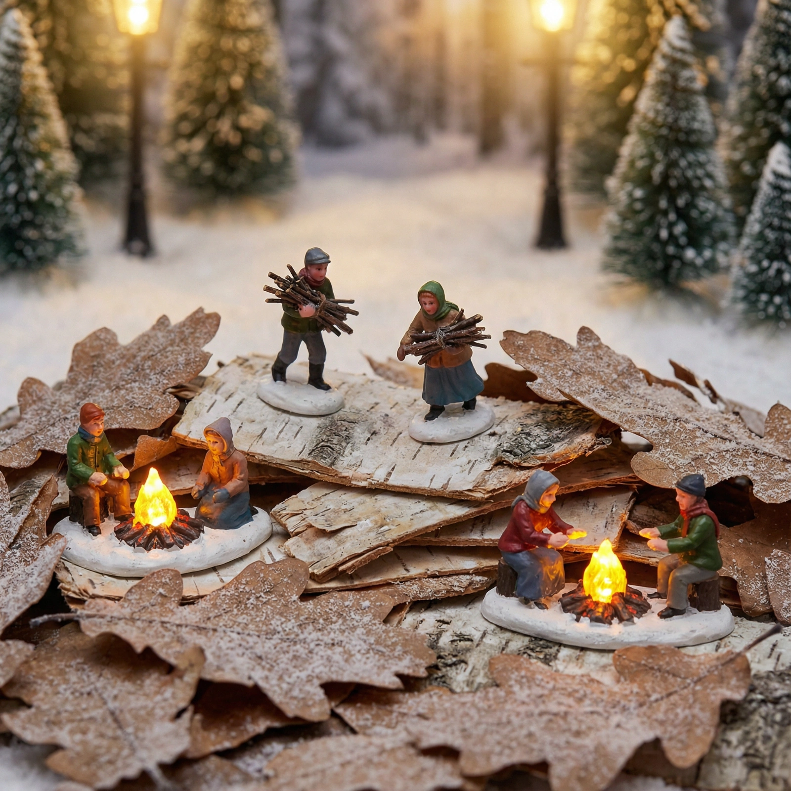 Micro diorama: tiny people [gathering firewood and warming hands around tiny fires] on/with [stacked bark pieces and dried leaves], winter forest background, soft golden light. AR 1:1
