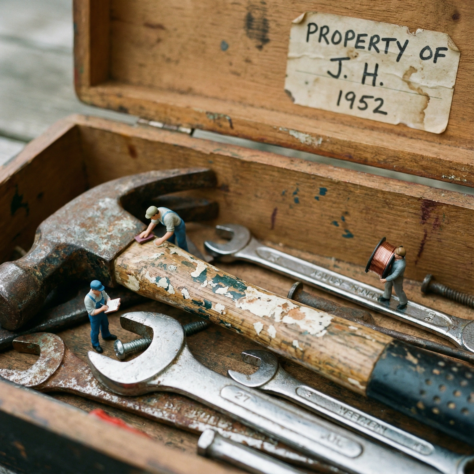 A close-up view of a well-used toolbox, each tool marked by years of wear scratches, chipped paint, and polished metal softened by use. Tiny miniature workmen are scattered among the tools: one sanding a worn handle, another inspecting a screw with a clipboard, a third carrying a coil of wire across the metal surface. A small handwritten label is taped inside the lid, barely legible. The scene feels intimate and quietly alive, focusing on texture, scale contrast, age, and subtle human presence. Rendered in detailed macro-style realism with shallow depth of field and natural light.