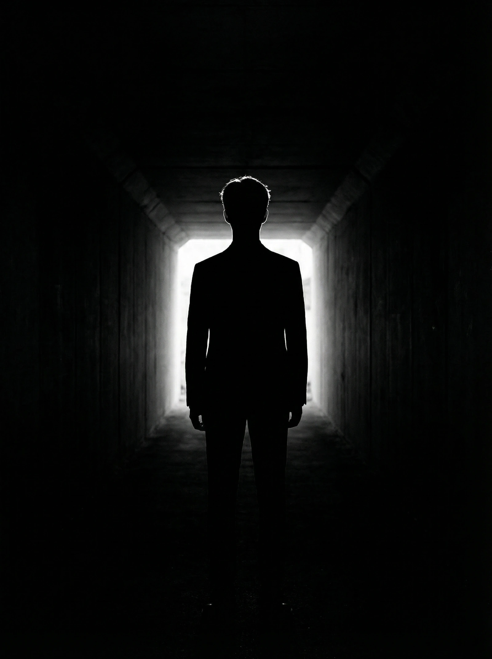 A stark silhouette of a person standing in a tunnel. The light comes from the end of the tunnel, creating a rim light around the figure. The rest of the image is pitch black.