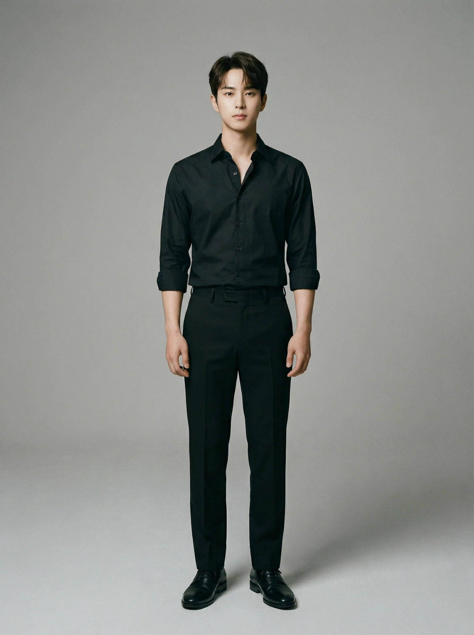 Create an ultra-realistic, full-body studio fashion portrait of a male model, inspired by modern minimalist menswear aesthetics. Use the uploaded face image as the ONLY facial reference. 🔐 ABSOLUTE IDENTITY LOCK — NON-NEGOTIABLE The face must match the uploaded image 100% with forensic accuracy Identity must remain perfectly consistent from ALL angles: Front 45° angle Side profile Slight high and low angles ❌ No facial reinterpretation ❌ No beautification or attractiveness enhancement ❌ No AI smoothing, symmetry correction, or face optimization ❌ No face blending, swapping, or replacement ❌ No identity drift due to lighting, depth, or perspective 🧬 FACIAL PRESERVATION (MANDATORY) Preserve every real facial detail exactly as in the uploaded image: Exact skull shape, jawline, cheekbones Natural skin texture, pores, fine lines, imperfections Exact eye shape, eyelids, gaze depth Exact nose structure, bridge, nostrils Exact lip shape and proportions Neutral, confident expression (no smile) 👔 OUTFIT & STYLING Fitted black button-down shirt Matte fabric Top 1–2 buttons open Sleeves rolled just below the elbows Tailored black formal trousers Clean crease Perfectly fitted waist and length Black polished leather dress shoes No accessories, no jewelry Clean, sharp, masculine silhouette 🧍 BODY & POSE Natural upright standing pose Relaxed shoulders, arms resting naturally at sides Athletic but realistic body proportions No exaggerated musculature 🎥 CAMERA & COMPOSITION Full-body frame, eye-level camera Neutral lens perspective (no distortion) Perfect anatomical proportions Studio-grade sharp focus 💡 LIGHTING & ENVIRONMENT Soft, diffused studio lighting Subtle shadow definition for depth Plain neutral grey background Clean editorial fashion look No dramatic or cinematic effects 🧪 REALISM ENFORCEMENT Photographic realism DSLR quality Natural skin tones No stylization, illustration, or artistic filters Looks indistinguishable from a real studio photograph 🚫 NEGATIVE PROMPT (IMPORTANT) cartoon, anime, CGI, 3D render, beauty filter, face enhancement, facial symmetry correction, unrealistic skin, plastic skin, over-sharp, painterly, stylized lighting, cinematic color grading, identity drift, face mismatch, altered facial structure Create image
