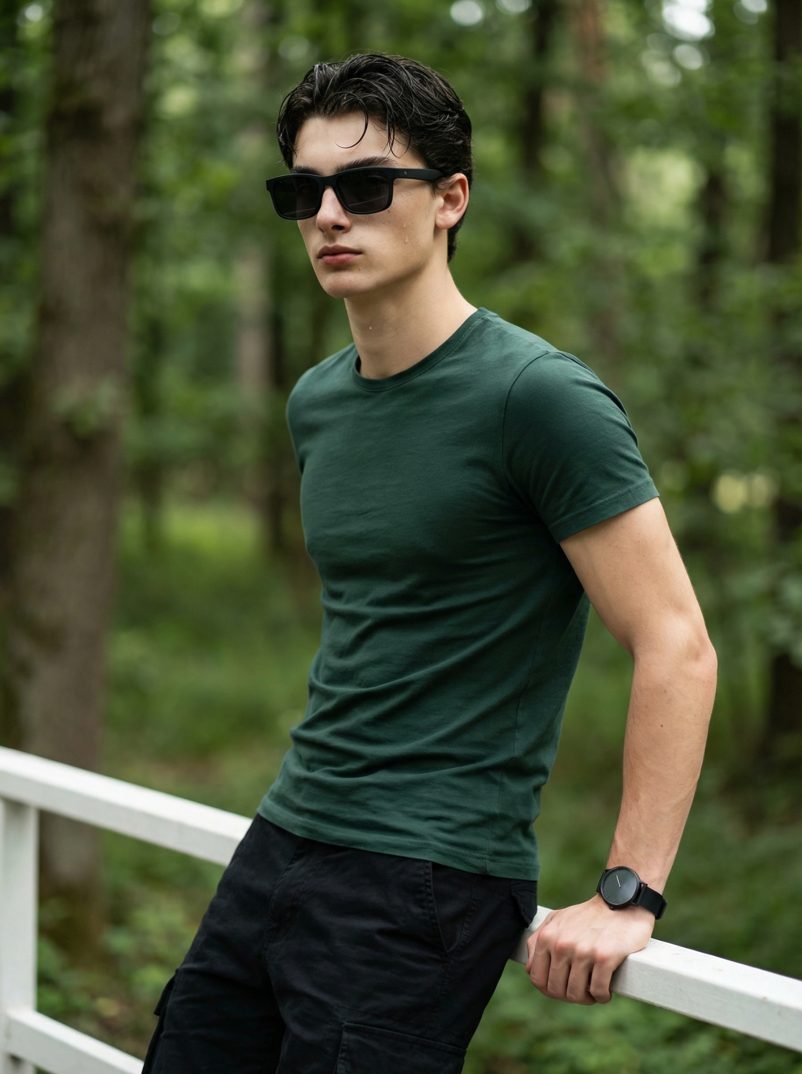 🔒 ULTRA-REALISTIC CINEMATIC PORTRAIT PROMPT (SPEC-FACE + IDENTITY LOCK) Create an ultra-realistic, cinematic lifestyle portrait of one young man only, using the uploaded image as the ONLY facial and body reference. 🔐 ABSOLUTE IDENTITY LOCK — NON-NEGOTIABLE The subject’s face must match the uploaded image 100% with forensic accuracy Same face at any angle (front, 45°, side profile, slight high/low angle) ❌ No beautification ❌ No facial reinterpretation ❌ No AI smoothing, symmetry correction, or face enhancement ❌ No face blending, replacement, or stylization Preserve every real facial detail exactly as in the uploaded image: Exact bone structure, jawline, cheekbones Natural skin texture, pores, subtle imperfections Exact eye shape, eyelids, gaze depth Nose shape, nostril width, bridge structure Lip shape, thickness, proportions Natural facial expression only 👓 SPEC-FACE DETAILS (MANDATORY) Black rectangular sunglasses with matte finish Sunglasses sit naturally on the nose bridge Eyes partially obscured but facial proportions remain unchanged No distortion of face due to eyewear 🔄 ANGLE CONSISTENCY RULE Camera angle may change, but facial identity and proportions must remain IDENTICAL under all lighting, depth, perspective, and shadow conditions. 👔 OUTFIT & STYLING Solid deep-green fitted crew-neck t-shirt Black cargo pants with visible side pockets Black minimalist wristwatch on left wrist Clean, modern casual styling Natural body proportions matching the uploaded image exactly 🧍 POSE & BODY LANGUAGE Subject standing casually, leaning lightly against a white railing One hand resting on the railing, relaxed posture Confident yet natural stance, not posed or exaggerated 🌿 ENVIRONMENT & BACKGROUND Outdoor setting with lush green forest scenery Soft natural daylight (overcast or diffused sunlight) Shallow depth of field with smooth background blur (bokeh) Background remains secondary; sharp focus on subject only 🎥 CINEMATIC & TECHNICAL SPECS Ultra-realistic photography 85mm lens look, f/1.8 depth of field Natural color grading, realistic contrast True-to-life skin tones High dynamic range 8K quality, extreme detail No artificial glow, no fantasy lighting 🚫 NEGATIVE PROMPT (IMPORTANT) Avoid: Face alteration Plastic skin Over-sharpening Cartoon, anime, illustration styles Unreal proportions Extra people Duplicate faces Artifacts or distortions Create image