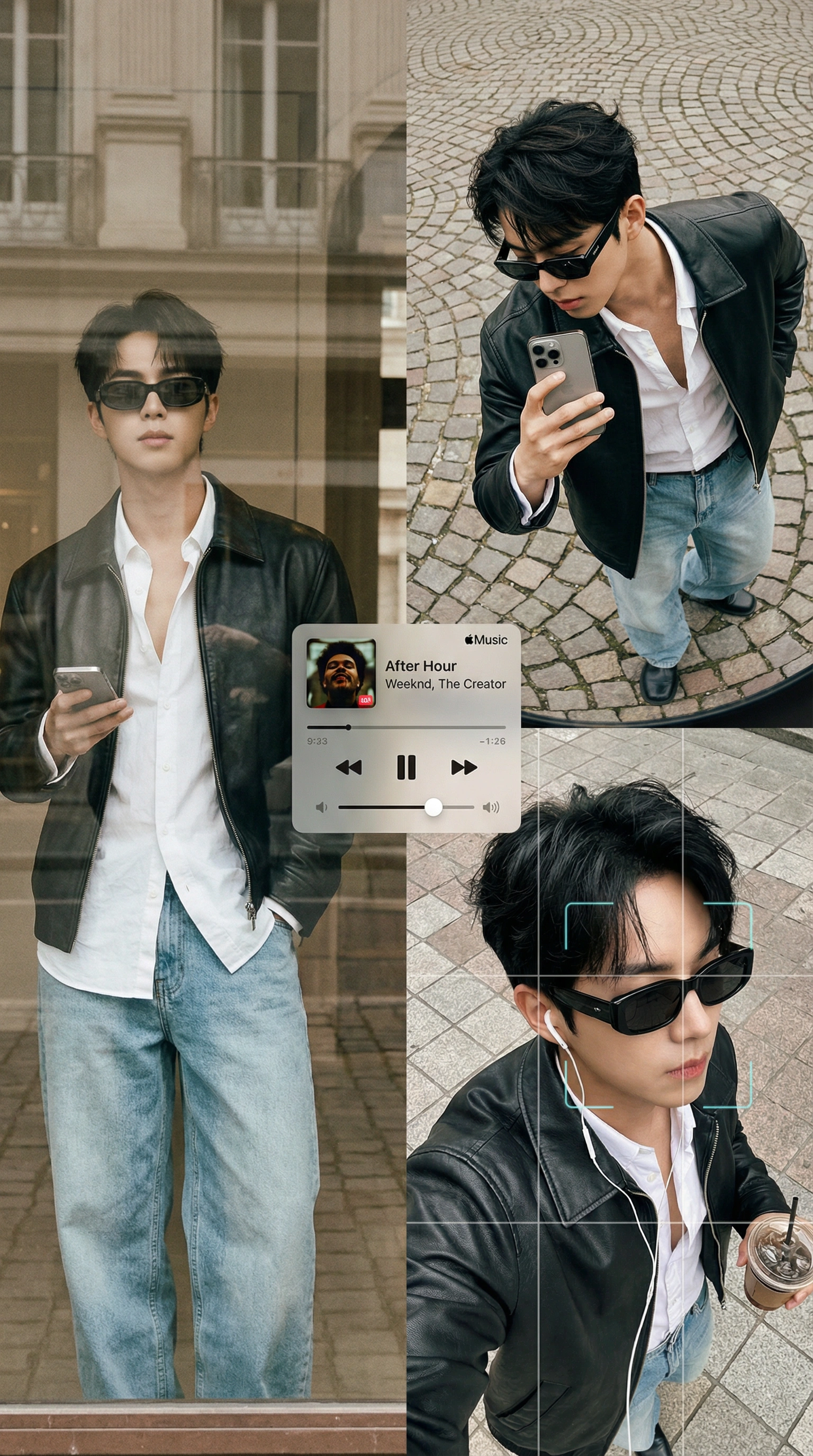 An editorial poster-style multi-panel collage presents Subject[person in the image, quiff-style tousled mid length black hair] across three asymmetric photographic frames, unified by a muted-brown urban streetwear aesthetic and a retro analog-digital fusion mood. The top-left frame captures a reflective window shot where the subject holds a phone in front of their face, dressed in a black leather jacket with a slight shine, a crisp white shirt worn casually unbuttoned at the top, light blue baggy denim jeans, and rectangular black sunglasses; the reflective surface introduces layered ghosting, faint architectural overlays, and a subtly stretched full-body silhouette shaped by the curvature of the glass. The top-right frame shifts into a close-range, downward-angled ultra-wide portrait taken on a cobblestone street, where the subject leans forward with hands in pockets and looks at his mobile phone (iPhone 16 Pro Max), wearing the same outfit paired with black rectangular sunglasses, while the cobblestones warp and radiate outward due to lens perspective distortion. The bottom-right frame becomes an intimate overhead selfie (looking at right side) with the subject holding a drink, still in the same wardrobe but now with wired earphones, the black rectangular sunglasses dominating the frame under soft overcast lighting, enhanced by faint digital-grid overlays and a minimal square facial-bounding graphic. Floating across the middle section of the poster is a translucent iOS-style Apple Music mini-player displaying “After Hour” by Weeknd, The Creator, featuring artwork, timeline, and playback controls without shadows, contributing to the minimal UI aesthetic alongside subtle cursor-like frame lines and rectangular highlights around the collage edges. The overall palette emphasizes warm ambers, washed neutrals, soft greys, reflective textures, wool plaid patterning, polished leather, and stone pavement, all rendered with realistic lighting and natural distortion patterns while avoiding stickers, extra subjects, wardrobe changes, incorrect UI icons, neon color shifts, or any futuristic sci-fi elements.