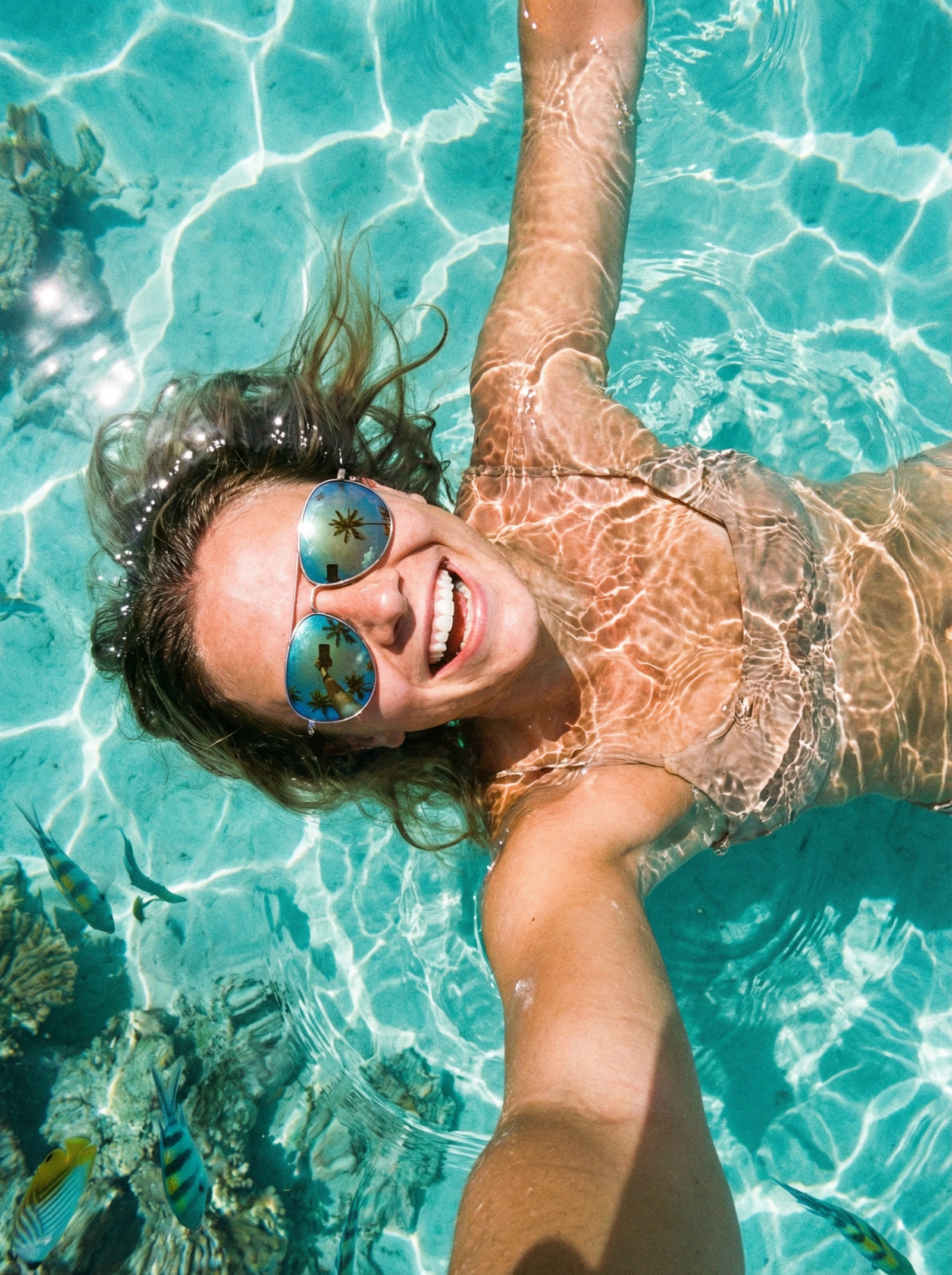 Capture a high-angle selfie-style portrait of a smiling person floating in crystal clear turquoise water. The sun is shining brightly, creating water caustics (light patterns) on their skin. They are wearing sunglasses reflecting the palm trees above. The mood is joyful and vibrant.