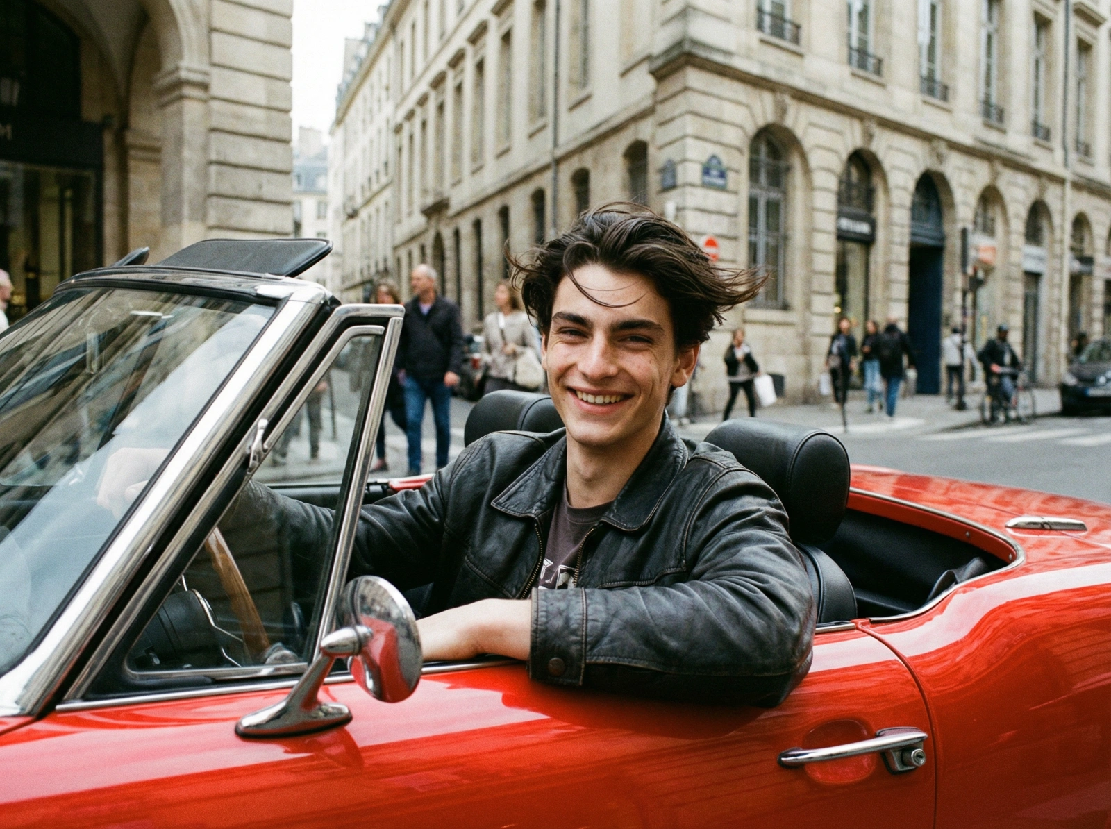 A stylish street photograph shows the person attached in the uploaded reference image (keep the face 100% accurate) sitting in a vintage convertible car. Wind moves their hair as they smile and rest their arm on the door.