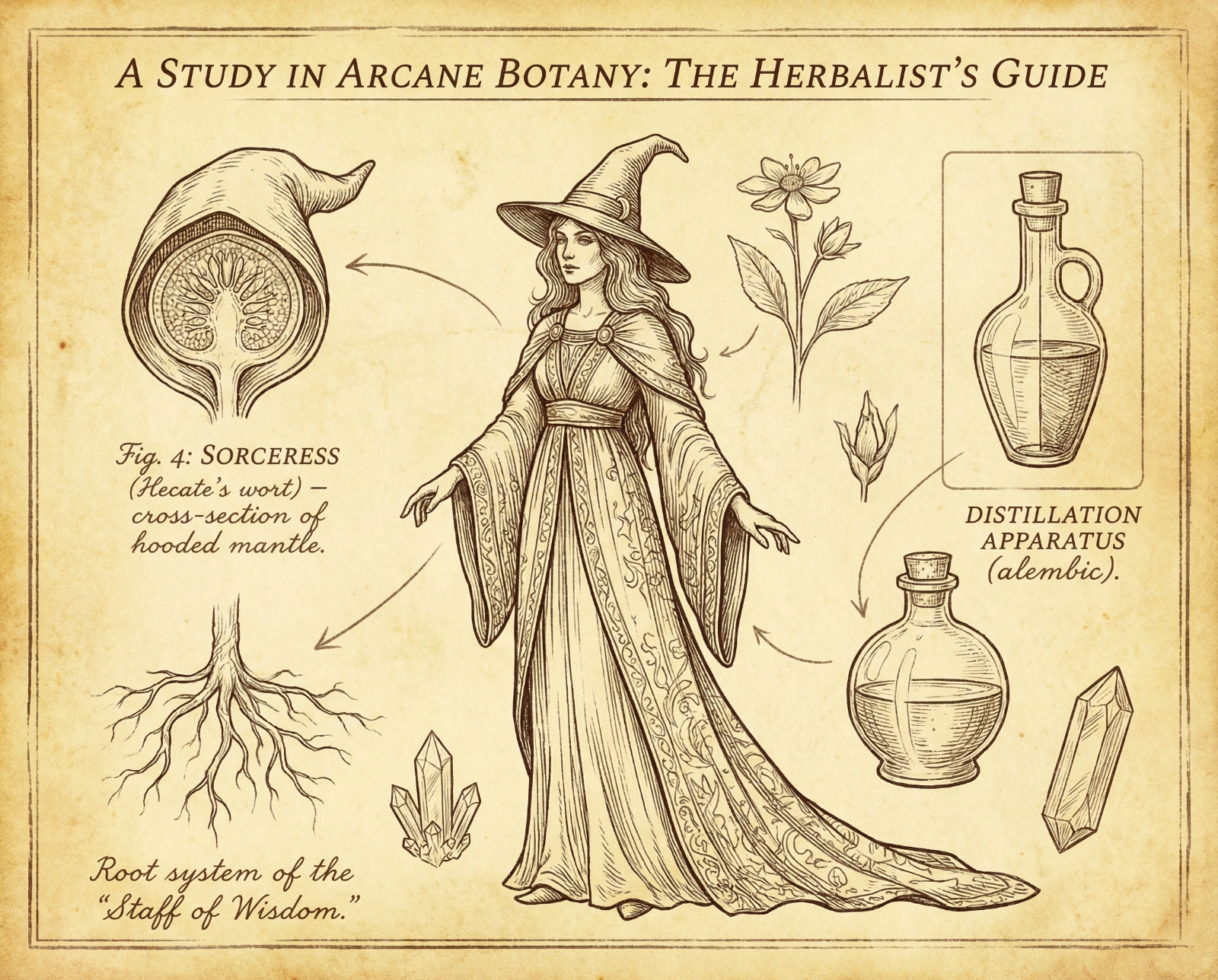 A botanical diagram of a sorceress, illustrated in the style of vintage scientific journals. Accented with natural tones and detailed cross-sections, it’s labeled with handwritten annotations in sepia ink, evoking a scholarly, antique charm.