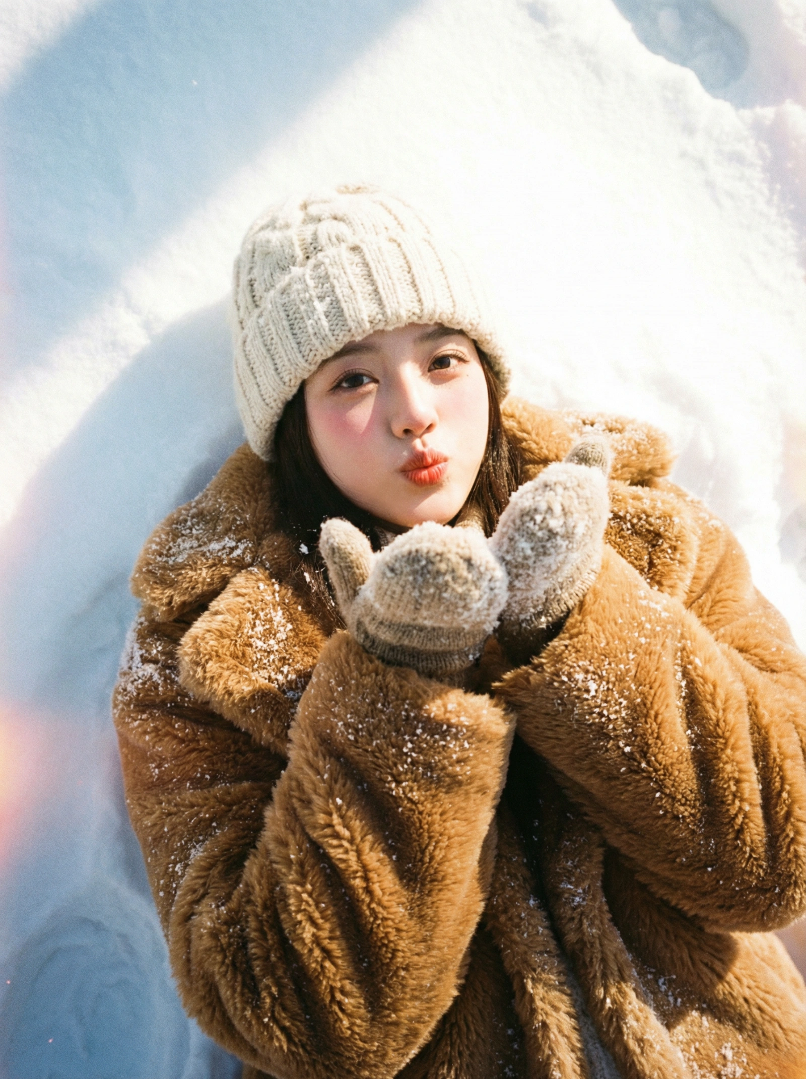 { "image_manifest": { "version": "4.0_Atomic_Film_Variant", "global_config": { "aspect_ratio": "3:4", "compositional_style": "Vintage Film Editorial / Fashion Magazine aesthetic", "output_fidelity": "Analog Film Photography (e.g., Kodak Portra 400 pushed)" }, "data_modules": { "subject_biometrics": { "identity_reference": "Ni Ni ", "fidelity_rules": [ "Capture Ni Ni's distinct charismatic features", "Emphasize natural film aesthetic over digital perfection" ], "surface_anatomy": { "texture": "Heavy organic film grain visible across skin and frame", "details": ["Natural rosy cheeks from cold", "Slight film halation around highlights"], "post_processing": "Chemical film development look / Bleach bypass feel" }, "kinesics": { "expression": "Playful cute pout, blowing a kiss towards the camera", "eye_contact": "Direct, sparkling with mischievous energy", "pose": "Recumbent in snow, arms playfully spread (modified snow-angel), head tilted up towards lens" } }, "apparel_stack": { "vibe": "Cozy oversized vintage winter fashion", "outer_shell": { "item": "Voluminous retro faux-fur coat", "color": "Warm caramel brown", "state": "Covered in fresh snow crystals" }, "accessories": { "head": "Chunky knitted beanie (cream color, slightly askew)", "neck": "Thick patterned wool scarf buried in snow", "hands": "Cute wool mittens brought near face for the pose" } }, "physics_engine": { "environment": "Deep fresh powder snow field, blindingly white", "lighting_model": { "source": "Harsh, direct bright winter sunlight", "properties": ["High contrast", "Blown-out highlights on snow and skin (intentional overexposure)", "Warm lens flare"] }, "material_rendering": { "film_artifacts": ["Visible color shifts", "Vignetting corners", "Occasional light leak"], "snow": "Highly reflective, creating glare and overexposed patches due to bright sun" } }, "optical_constraints": { "camera": { "type": "Vintage Analog SLR", "focal_length": "50mm Vintage Prime Lens", "aperture": "f/2.8", "focus": "Sharp on Ni Ni's eyes and pouting lips, softer focus elsewhere due to lens character" }, "framing": { "type": "Medium Close-up (Chest up)", "perspective": "High-angle, looking directly down at subject" } } }, "exclusion_array": { "forbidden_styles": ["Clean Digital", "CGI", "Smooth skin", "HDR", "Modern commercial photography"], "forbidden_artifacts": ["Digital noise (must be film grain)", "Plastic texture"] } } }