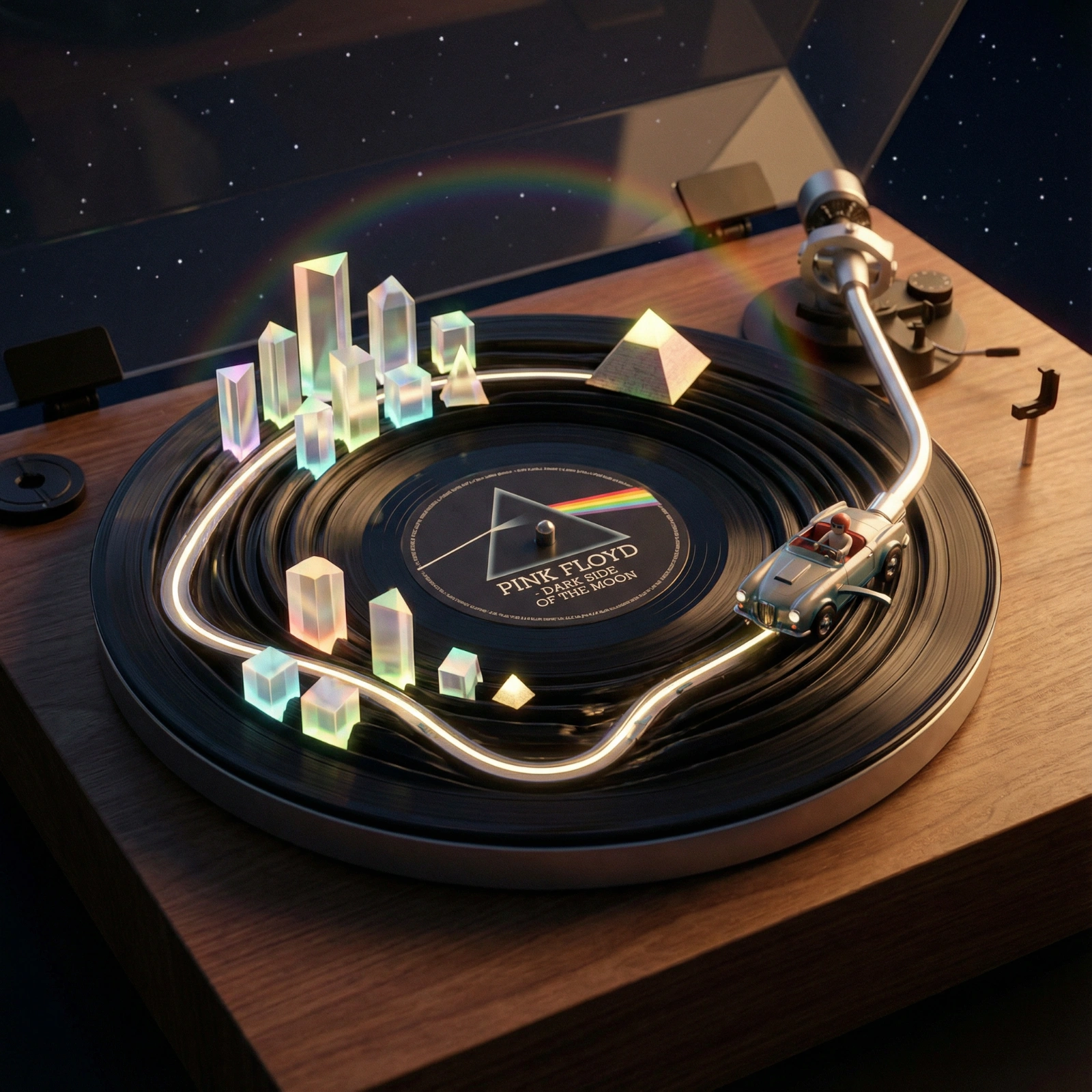 <instructions> Input: A classic album (e.g., Pink Floyd - Dark Side of the Moon). Action: A vinyl record spinning on a turntable. Visual: The grooves of the record rise up to form the circular landscape of the album's theme (e.g., a prism city). The needle is a tiny car/character driving through the groove-canyons. </instructions>