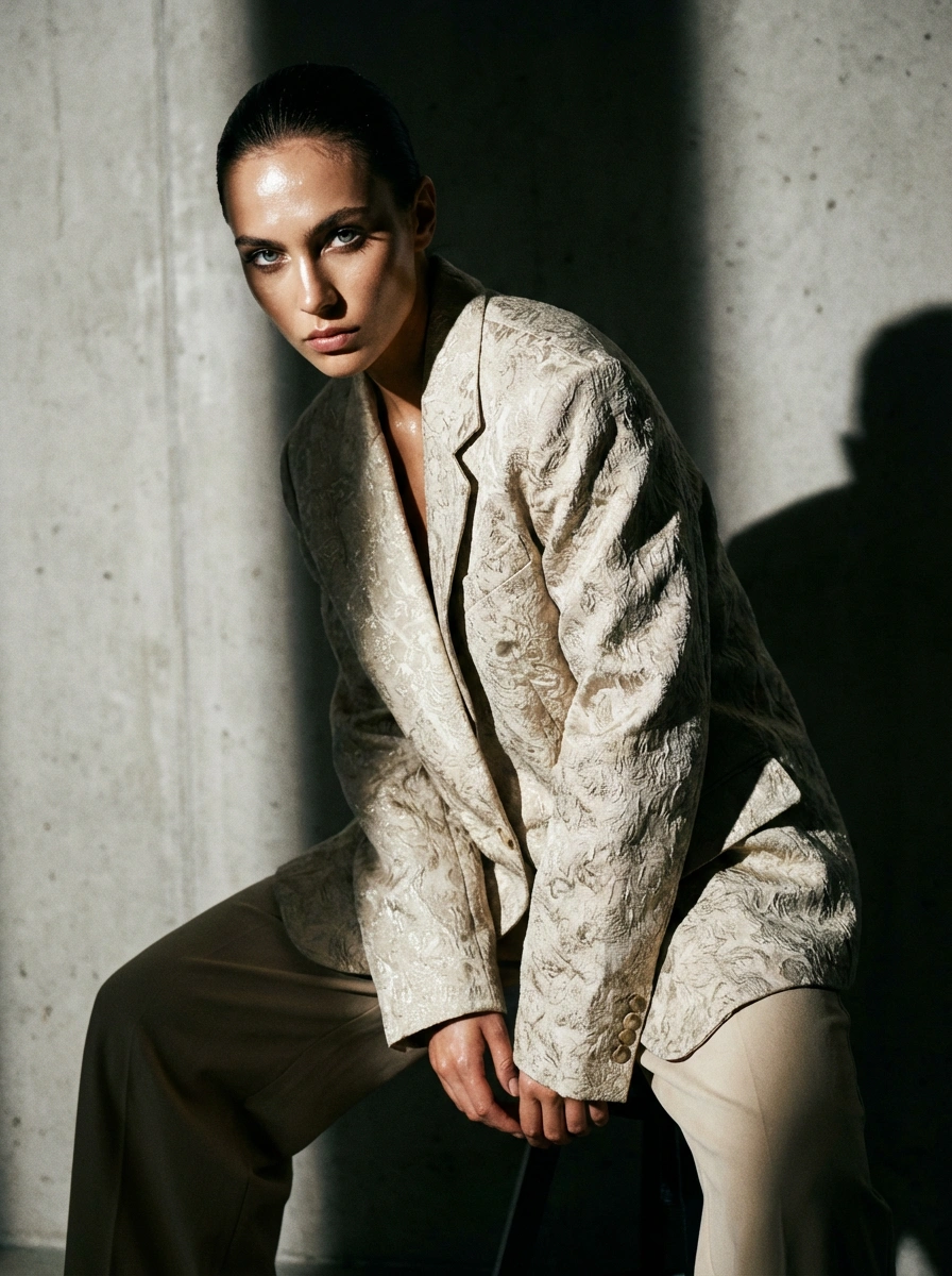 realistic fashion editorial portrait, studio lighting, high contrast shadows, glossy skin highlights, dramatic posing, Vogue-style composition, medium format camera look, impeccable detail, sharp eyes, textured clothing