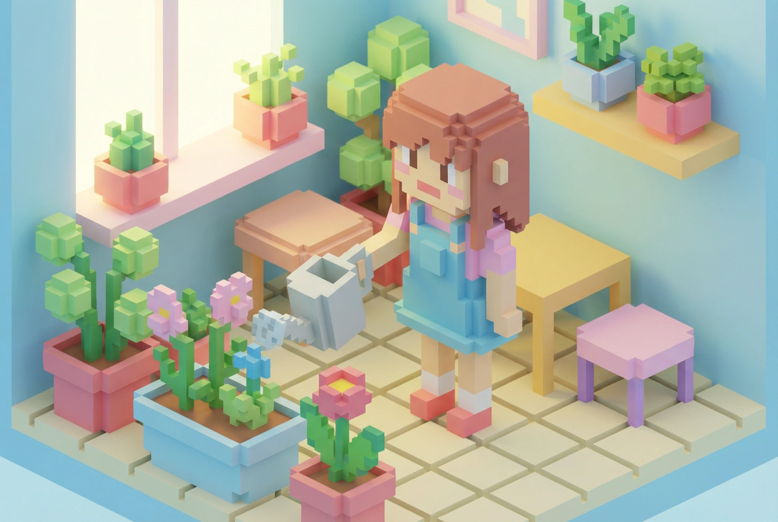 A voxel-style 3D render of [a girl watering plants], composed of small colored cubes, sharp pixel edges, stylized lighting, pastel tones, displayed in a playful isometric room with minimal furniture, game asset aesthetic. --ar 3:2 --v 7